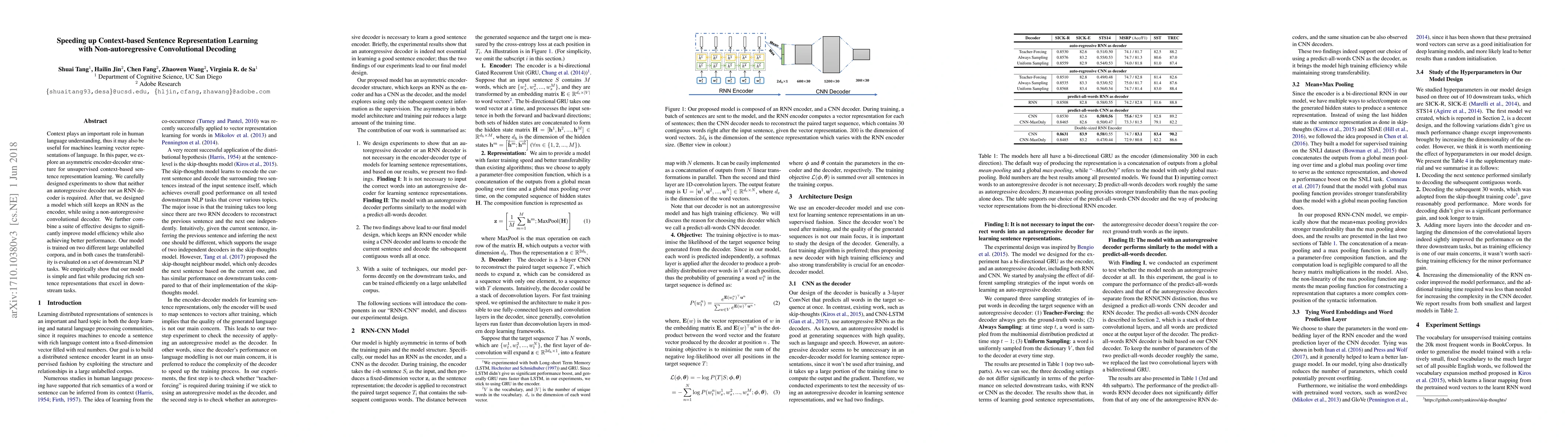 This paper proposes an efficient non-autoregressive convolutional decoder for context-based sentence representation learning, eliminating the need for autoregressive or RNN decoders. The model, trained on large unlabelled corpora, achieves better performance and transferability for downstream NLP tasks compared to traditional methods.