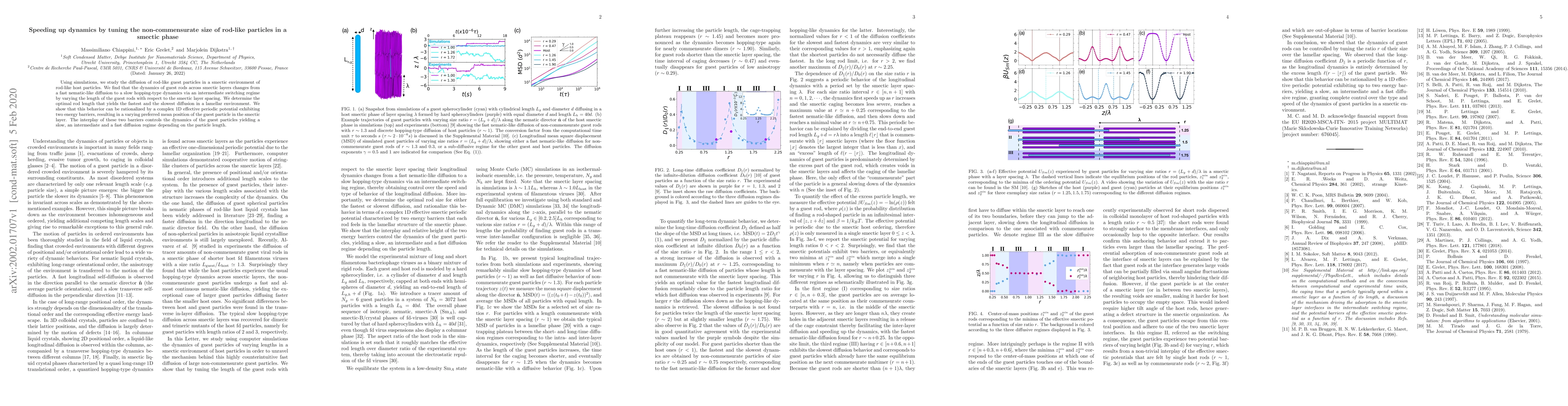 This paper uses simulations to explore how varying the size of rod-like guest particles affects their diffusion in a smectic phase of rod-like host particles. The study reveals that guest rod length influences the dynamics, transitioning from fast nematic-like diffusion to slow hopping-type dynamics, with an optimal rod length for both fastest and slowest diffusion determined by the interplay of two energy barriers in a 1D effective periodic potential.