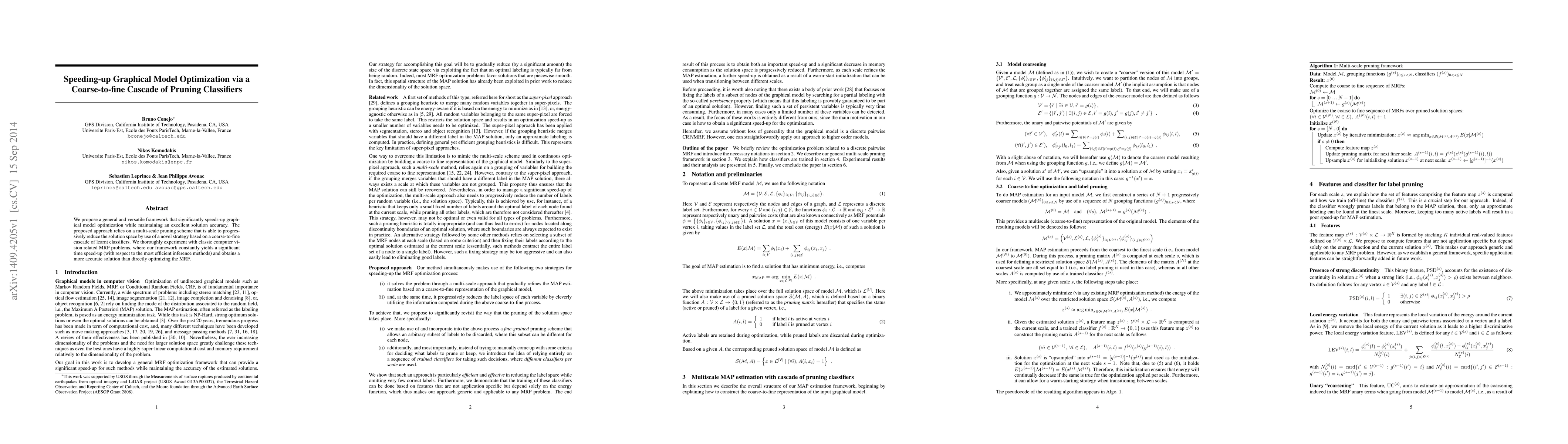 This paper proposes a framework that speeds up graphical model optimization while maintaining accuracy, using a multi-scale pruning scheme with a coarse-to-fine cascade of classifiers.