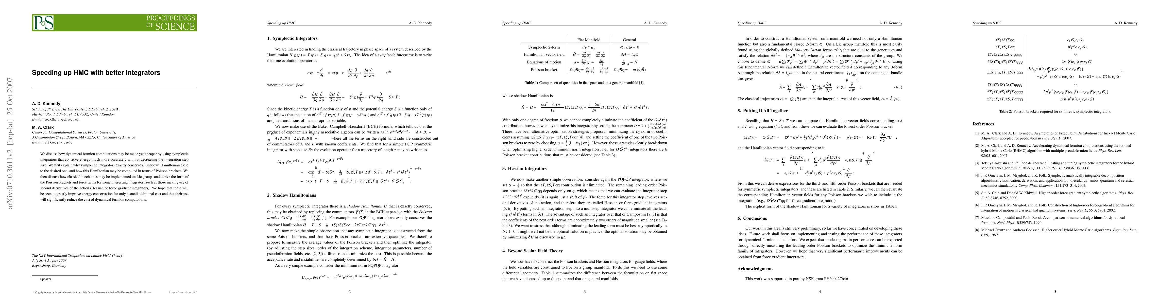 We discuss how dynamical fermion computations may be made yet cheaper by using symplectic integrators that conserve energy much more accurately without decreasing the integration step size. We first explain why symplectic integrators exactly conserve a ``shadow'' Hamiltonian close to the desired one, and how this Hamiltonian may be computed in terms of Poisson brackets. We then discuss how classical mechanics may be implemented on Lie groups and derive the form of the Poisson brackets and force terms for some interesting integrators such as those making use of second derivatives of the action (Hessian or force gradient integrators). We hope that these will be seen to greatly improve energy conservation for only a small additional cost and that their use will significantly reduce the cost of dynamical fermion computations.