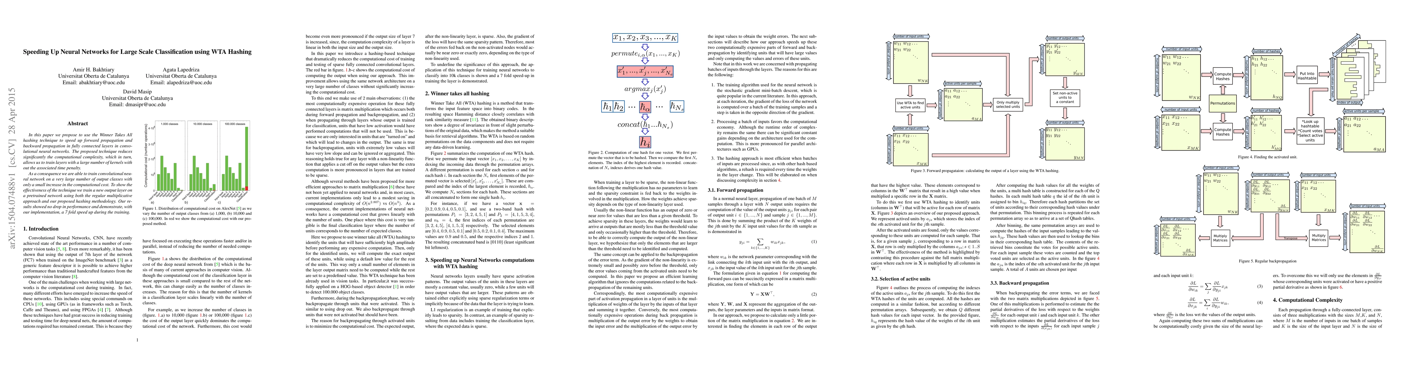 This paper proposes using Winner Takes All hashing to speed up neural network training by reducing computational complexity in convolutional layers. The technique allows training networks with many kernels and numerous output classes with minimal performance loss and a 7-fold training speed increase.