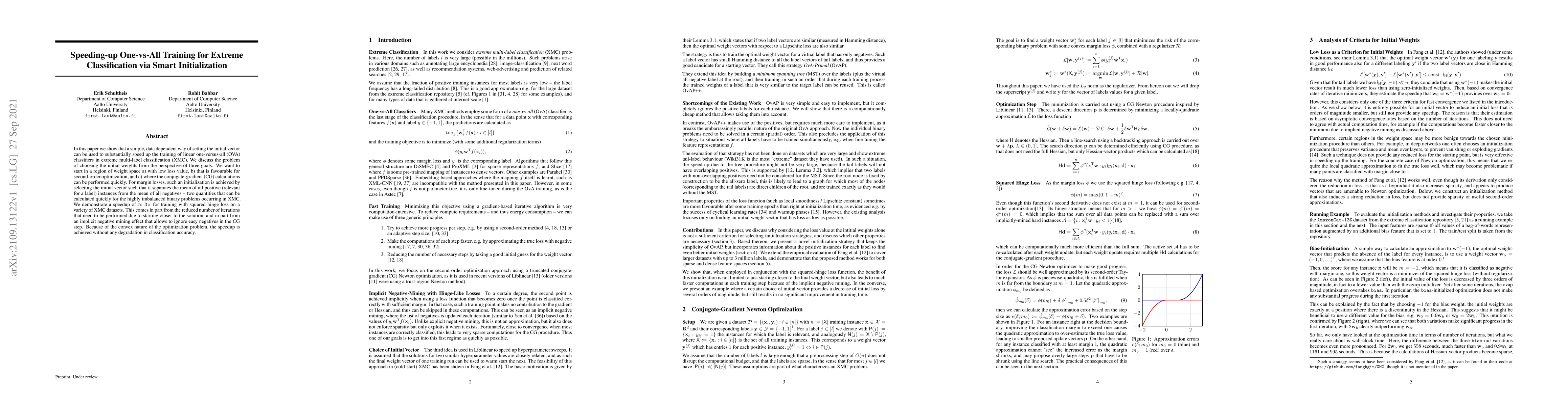 Researchers found a method to speed up training of linear one-versus-all classifiers in extreme multi-label classification by choosing the initial vector based on separating positive and negative instances' means, achieving a 3x speedup without degrading accuracy.