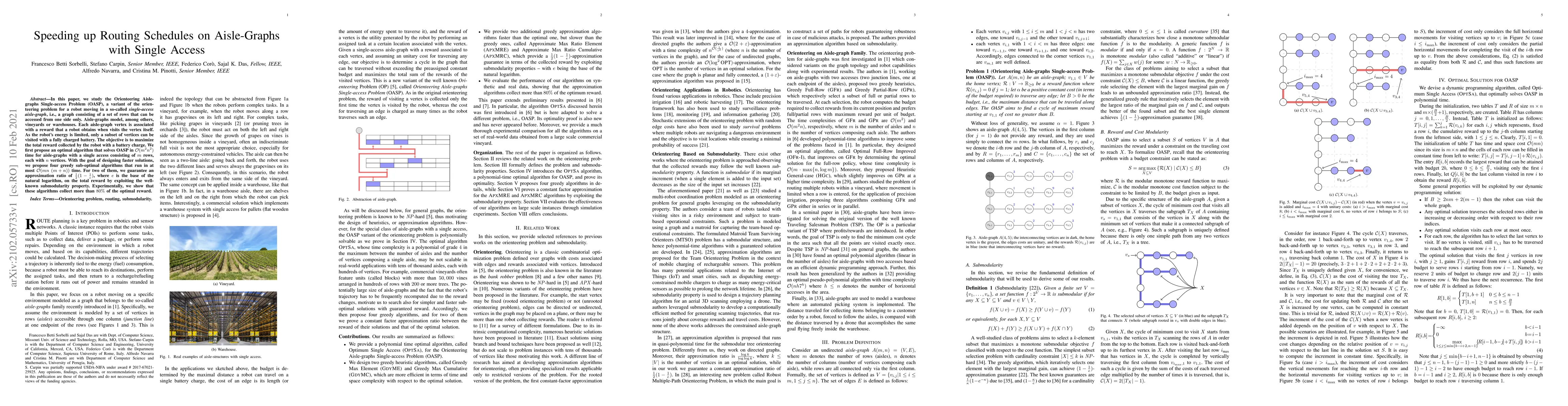 This paper presents an optimal algorithm for the Orienteering Aisle-graphs Single-access Problem (OASP), improving upon it with four greedy sub-optimal algorithms running faster, collecting over 80% of the optimal reward, and guaranteeing a 1/2(1-1/e) approximation ratio.