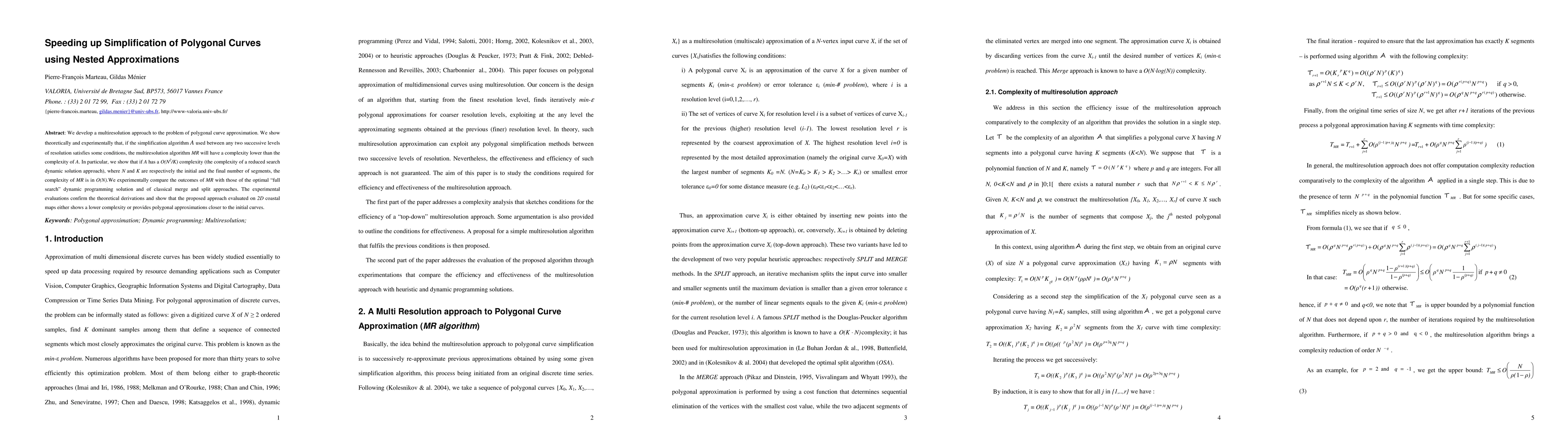 We develop a multiresolution approach to the problem of polygonal curve approximation. We show theoretically and experimentally that, if the simplification algorithm A used between any two successive levels of resolution satisfies some conditions, the multiresolution algorithm MR will have a complexity lower than the complexity of A. In particular, we show that if A has a O(N2/K) complexity (the complexity of a reduced search dynamic solution approach), where N and K are respectively the initial and the final number of segments, the complexity of MR is in O(N).We experimentally compare the outcomes of MR with those of the optimal "full search" dynamic programming solution and of classical merge and split approaches. The experimental evaluations confirm the theoretical derivations and show that the proposed approach evaluated on 2D coastal maps either shows a lower complexity or provides polygonal approximations closer to the initial curves.