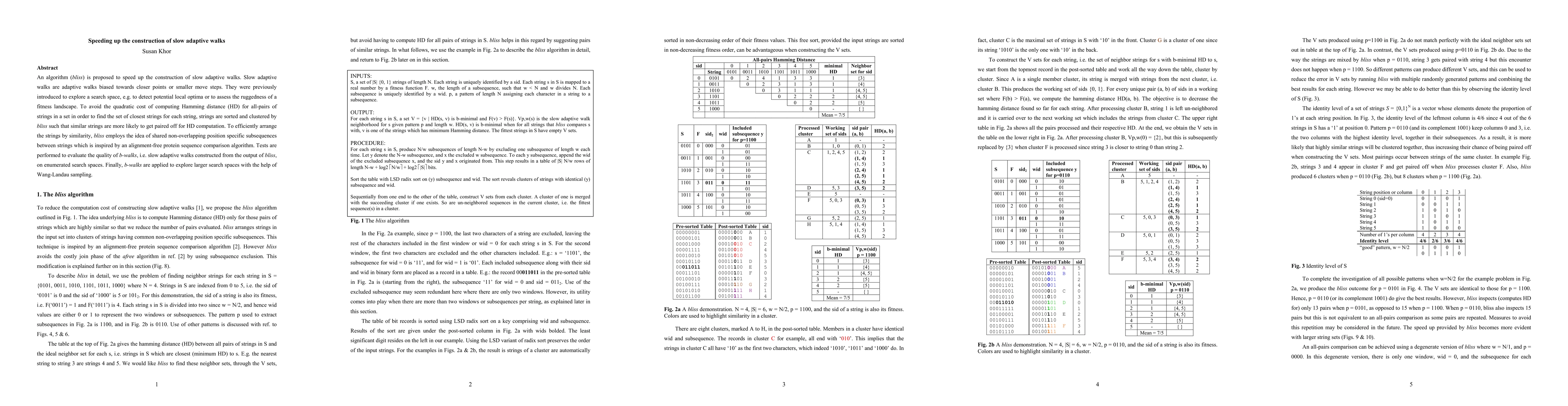 An algorithm (bliss) is proposed to speed up the construction of slow adaptive walks. Slow adaptive walks are adaptive walks biased towards closer points or smaller move steps. They were previously introduced to explore a search space, e.g. to detect potential local optima or to assess the ruggedness of a fitness landscape. To avoid the quadratic cost of computing Hamming distance (HD) for all-pairs of strings in a set in order to find the set of closest strings for each string, strings are sorted and clustered by bliss such that similar strings are more likely to get paired off for HD computation. To efficiently arrange the strings by similarity, bliss employs the idea of shared non-overlapping position specific subsequences between strings which is inspired by an alignment-free protein sequence comparison algorithm. Tests are performed to evaluate the quality of b-walks, i.e. slow adaptive walks constructed from the output of bliss, on enumerated search spaces. Finally, b-walks are applied to explore larger search spaces with the help of Wang-Landau sampling.