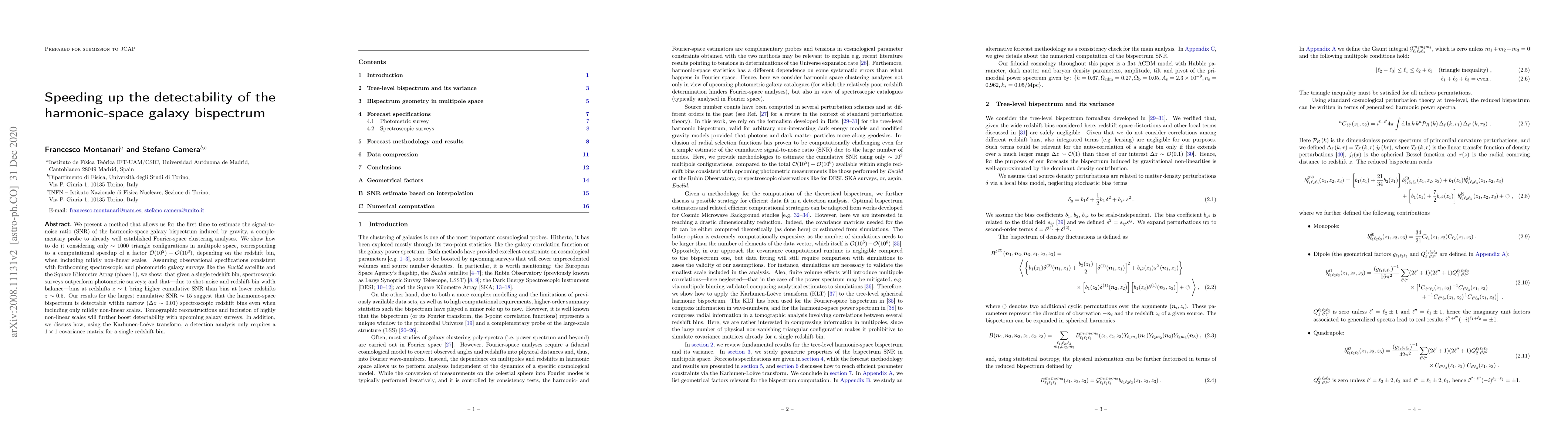 We present a method that allows us for the first time to estimate the signal-to-noise ratio (SNR) of the harmonic-space galaxy bispectrum induced by gravity, a complementary probe to already well established Fourier-space clustering analyses. We show how to do it considering only $\sim1000$ triangle configurations in multipole space, corresponding to a computational speedup of a factor $\mathcal{O}(10^2)-\mathcal{O}(10^3)$, depending on the redshift bin, when including mildly non-linear scales. Assuming observational specifications consistent with forthcoming spectroscopic and photometric galaxy surveys like the Euclid satellite and the Square Kilometre Array (phase 1), we show: that given a single redshift bin, spectroscopic surveys outperform photometric surveys; and that -- due to shot-noise and redshift bin width balance -- bins at redshifts $z\sim1$ bring higher cumulative SNR than bins at lower redshifts $z \sim 0.5$. Our results for the largest cumulative SNR $\sim 15$ suggest that the harmonic-space bispectrum is detectable within narrow ($\Delta z \sim 0.01$) spectroscopic redshift bins even when including only mildly non-linear scales. Tomographic reconstructions and inclusion of highly non-linear scales will further boost detectability with upcoming galaxy surveys. In addition, we discuss how, using the Karhunen-Lo\`eve transform, a detection analysis only requires a $1 \times 1$ covariance matrix for a single redshift bin.
