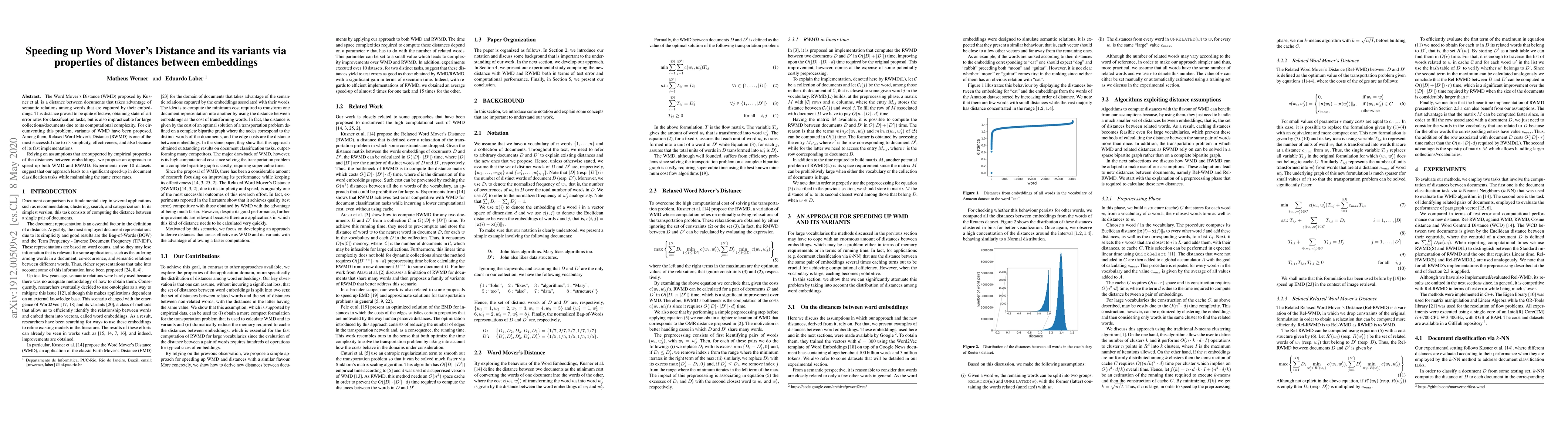 This paper proposes a method to accelerate the computation of Word Mover's Distance (WMD) and its variant, Relaxed Word Mover's Distance (RWMD), by leveraging properties of distances between embeddings. Experimental results on 10 datasets show significant speed-ups in document classification tasks without compromising accuracy.