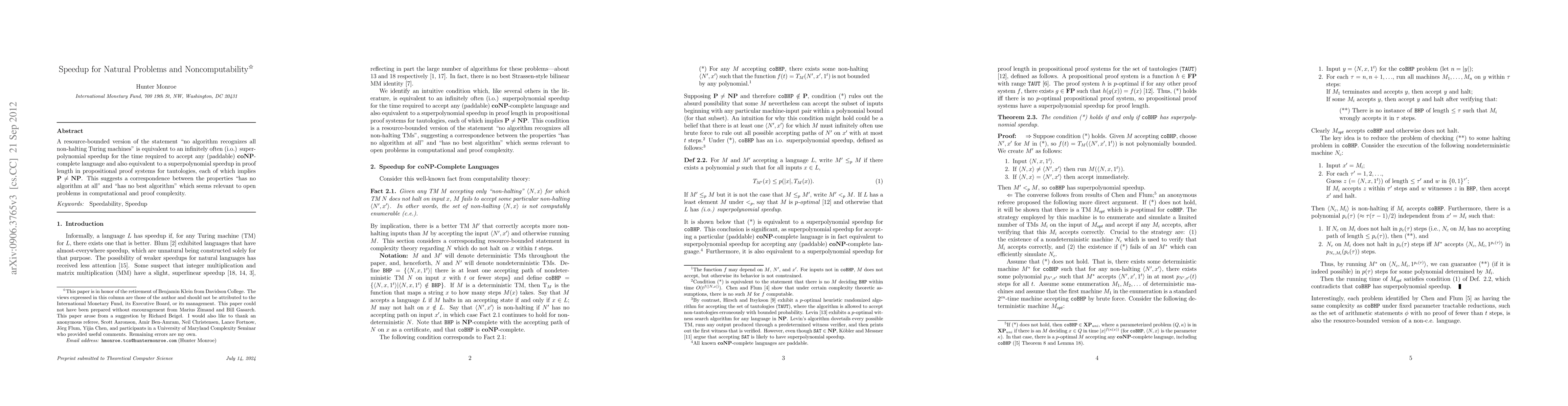 This paper explores the equivalence of a noncomputability statement with superpolynomial speedups in both time complexity for coNP-complete languages and proof length in propositional proof systems, suggesting a connection between the absence of any algorithm and the absence of the best algorithm, relevant to the P vs NP problem.