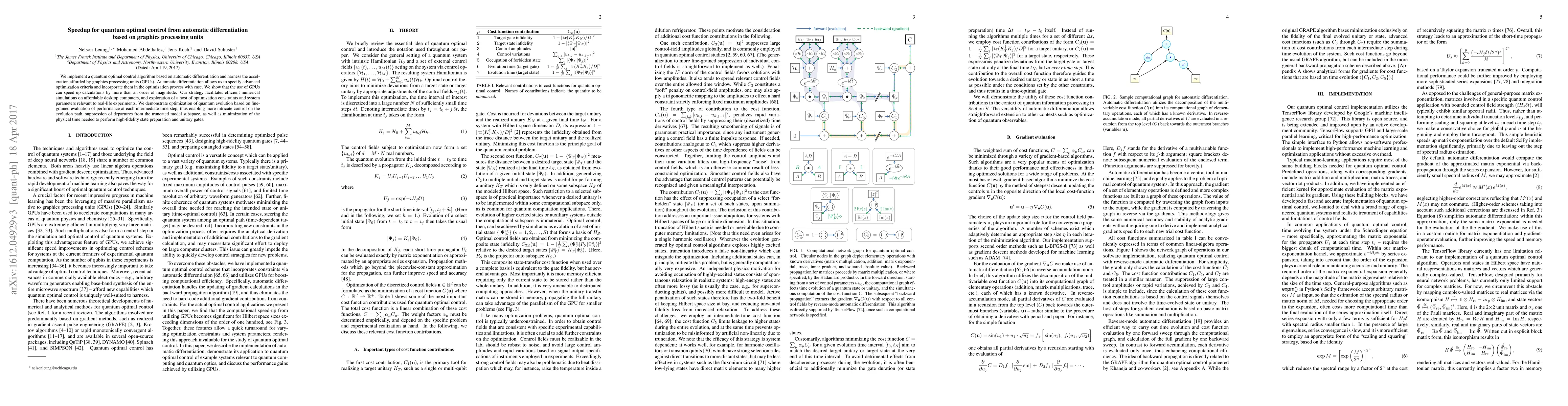 This paper presents a quantum optimal control algorithm utilizing automatic differentiation on GPUs, achieving over tenfold speedup in calculations. The approach enables efficient simulations and optimization of quantum evolution, allowing for fine-grained control and minimization of time for high-fidelity state preparation and unitary gates.