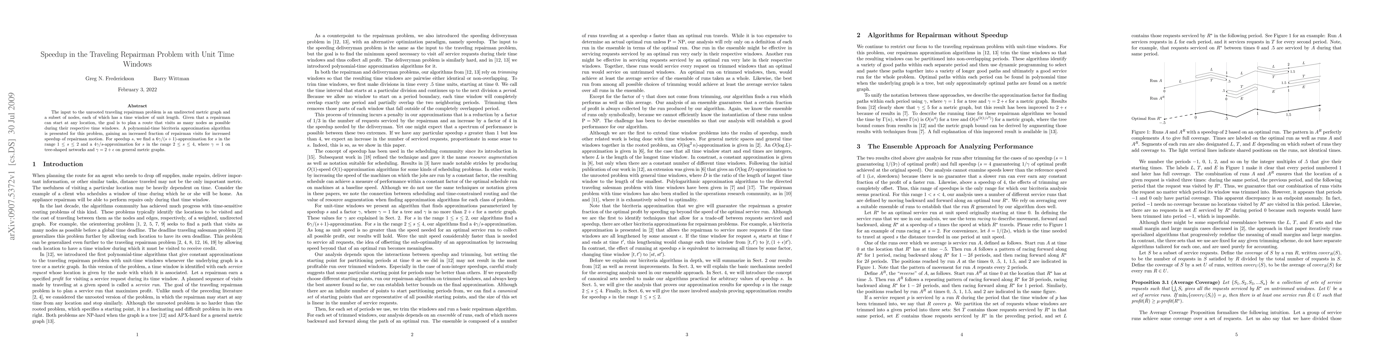 The input to the unrooted traveling repairman problem is an undirected metric graph and a subset of nodes, each of which has a time window of unit length. Given that a repairman can start at any location, the goal is to plan a route that visits as many nodes as possible during their respective time windows. A polynomial-time bicriteria approximation algorithm is presented for this problem, gaining an increased fraction of repairman visits for increased speedup of repairman motion. For speedup $s$, we find a $6\gamma/(s + 1)$-approximation for $s$ in the range $1 \leq s \leq 2$ and a $4\gamma/s$-approximation for $s$ in the range $2 \leq s \leq 4$, where $\gamma = 1$ on tree-shaped networks and $\gamma = 2 + \epsilon$ on general metric graphs.