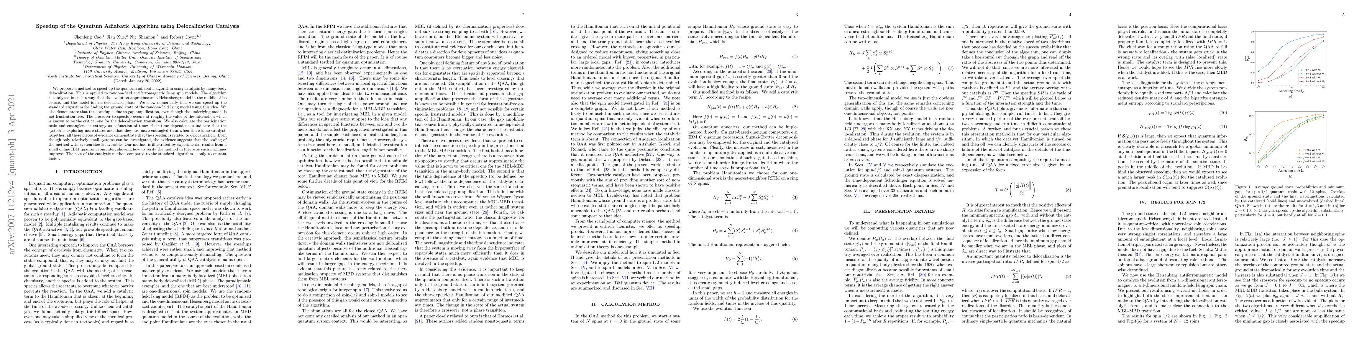 We propose a method to speed up the quantum adiabatic algorithm using catalysis by many-body delocalization. This is applied to random-field antiferromagnetic Ising spin models. The algorithm is catalyzed in such a way that the evolution approximates a Heisenberg model in the middle of its course, and the model is in a delocalized phase. We show numerically that we can speed up the standard algorithm for finding the ground state of the random-field Ising model using this idea. We also demonstrate that the speedup is due to gap amplification, even though the underlying model is not frustration-free. The crossover to speedup occurs at roughly the value of the interaction which is known to be the critical one for the delocalization transition. We also calculate the participation ratio and entanglement entropy as a function of time: their time dependencies indicate that the system is exploring more states and that they are more entangled than when there is no catalyst. Together, all these pieces of evidence demonstrate that the speedup is related to delocalization. Even though only relatively small systems can be investigated, the evidence suggests that the scaling of the method with system size is favorable. Our method is illustrated by experimental results from a small online IBM quantum computer, showing how to verify the method in future as such machines improve. The cost of the catalytic method compared to the standard algorithm is only a constant factor.