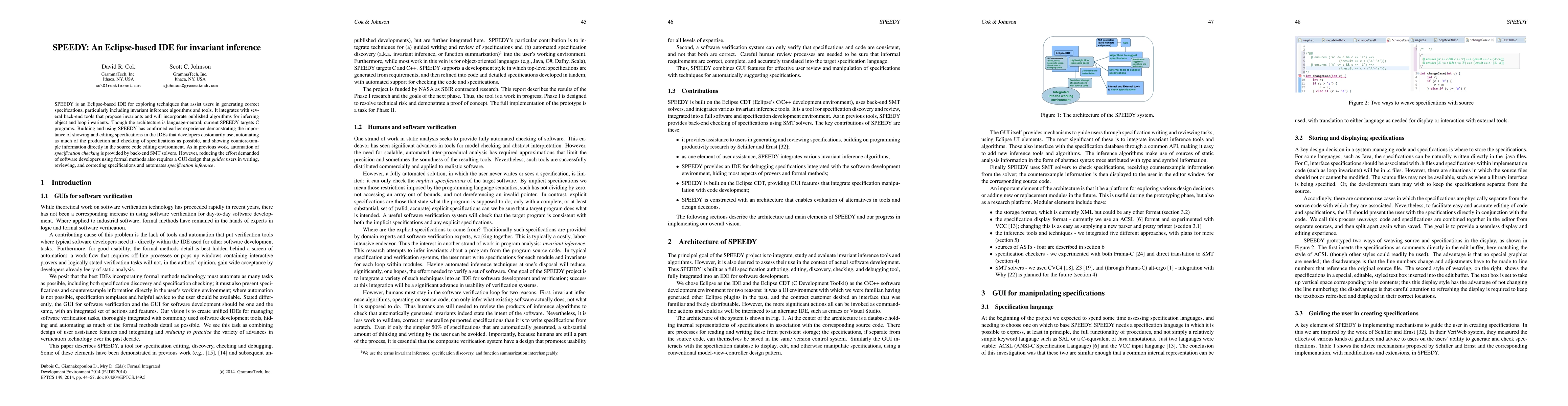 SPEEDY is an Eclipse-based IDE for exploring techniques that assist users in generating correct specifications, particularly including invariant inference algorithms and tools. It integrates with several back-end tools that propose invariants and will incorporate published algorithms for inferring object and loop invariants. Though the architecture is language-neutral, current SPEEDY targets C programs. Building and using SPEEDY has confirmed earlier experience demonstrating the importance of showing and editing specifications in the IDEs that developers customarily use, automating as much of the production and checking of specifications as possible, and showing counterexample information directly in the source code editing environment. As in previous work, automation of specification checking is provided by back-end SMT solvers. However, reducing the effort demanded of software developers using formal methods also requires a GUI design that guides users in writing, reviewing, and correcting specifications and automates specification inference.
