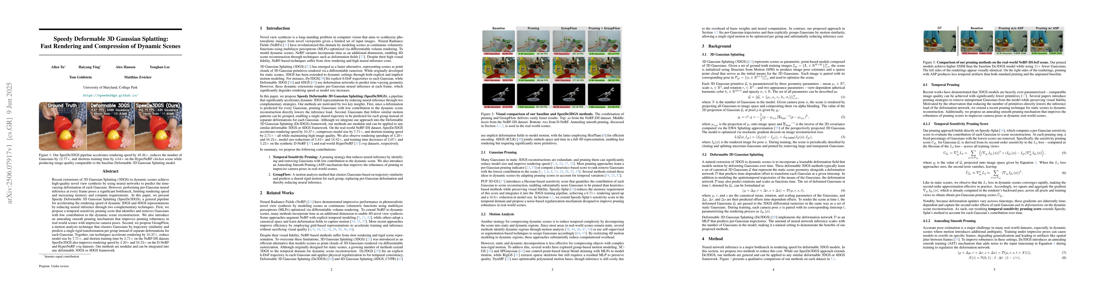 Researchers developed Speedy Deformable 3D Gaussian Splatting, a method to accelerate rendering speed of dynamic scenes by pruning neural networks and grouping Gaussians based on trajectory similarity.
