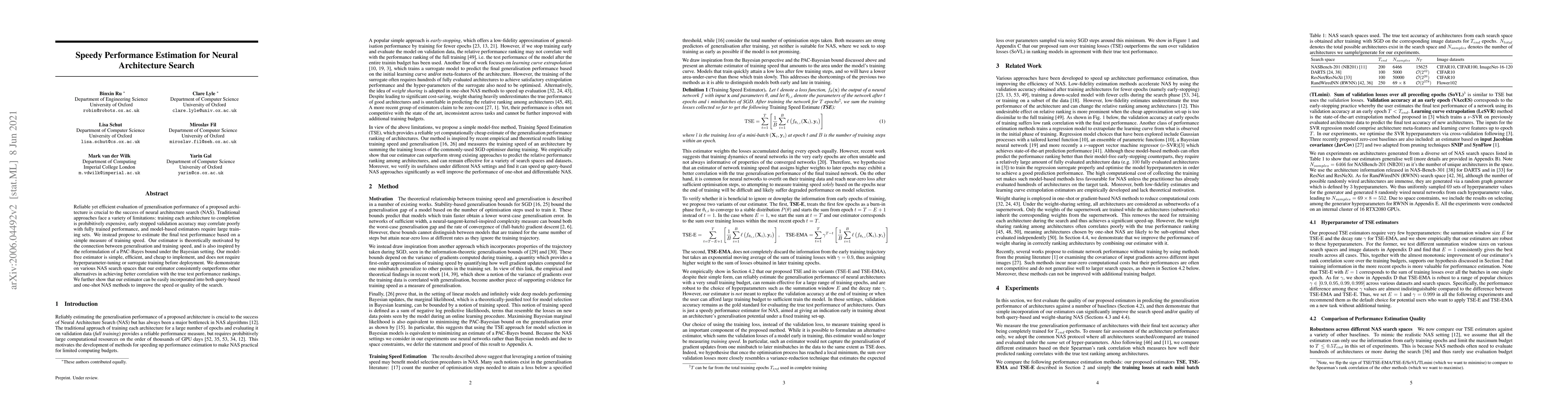 Reliable yet efficient evaluation of generalisation performance of a proposed architecture is crucial to the success of neural architecture search (NAS). Traditional approaches face a variety of limitations: training each architecture to completion is prohibitively expensive, early stopped validation accuracy may correlate poorly with fully trained performance, and model-based estimators require large training sets. We instead propose to estimate the final test performance based on a simple measure of training speed. Our estimator is theoretically motivated by the connection between generalisation and training speed, and is also inspired by the reformulation of a PAC-Bayes bound under the Bayesian setting. Our model-free estimator is simple, efficient, and cheap to implement, and does not require hyperparameter-tuning or surrogate training before deployment. We demonstrate on various NAS search spaces that our estimator consistently outperforms other alternatives in achieving better correlation with the true test performance rankings. We further show that our estimator can be easily incorporated into both query-based and one-shot NAS methods to improve the speed or quality of the search.