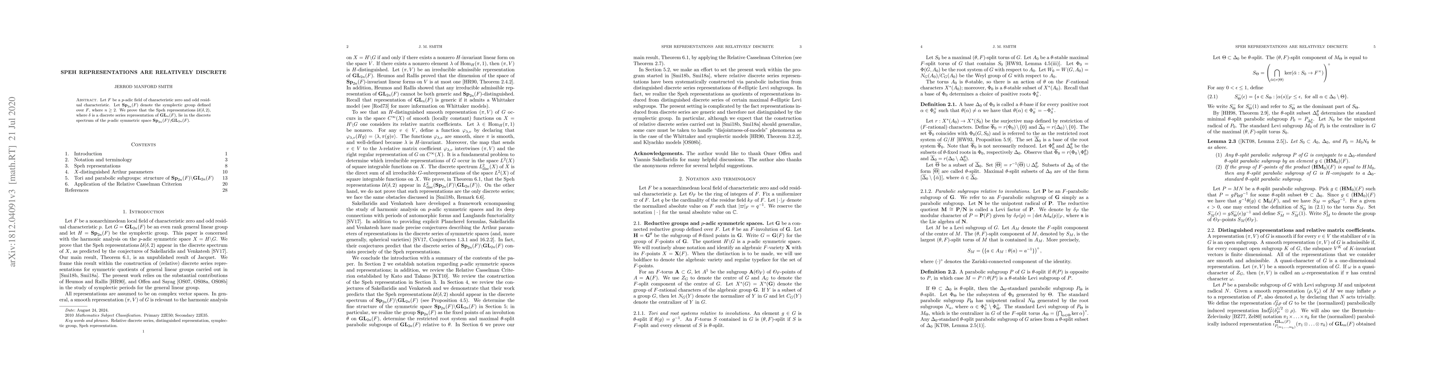 Let $F$ be a $p$-adic field of characteristic zero and odd residual characteristic. Let $\mathbf{Sp}_{2n}(F)$ denote the symplectic group defined over $F$, where $n\geq 2$. We prove that the Speh representations $\mathcal{U}(\delta,2)$, where $\delta$ is a discrete series representation of $\mathbf{GL}_n(F)$, lie in the discrete spectrum of the $p$-adic symmetric space $\mathbf{Sp}_{2n}(F) \backslash \mathbf{GL}_{2n}(F)$.