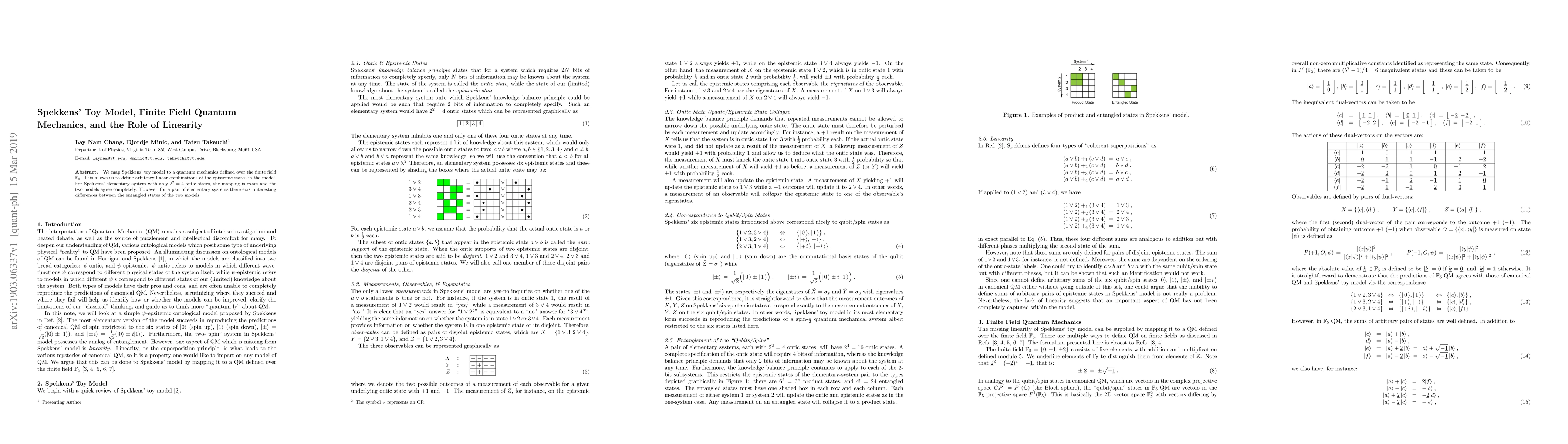 Summary: This paper maps Spekkens' toy model to a finite field quantum mechanics, showing exact agreement for a single elementary system but revealing differences in entangled states for a pair of systems. The study highlights the role of linearity in the epistemic states of the model.