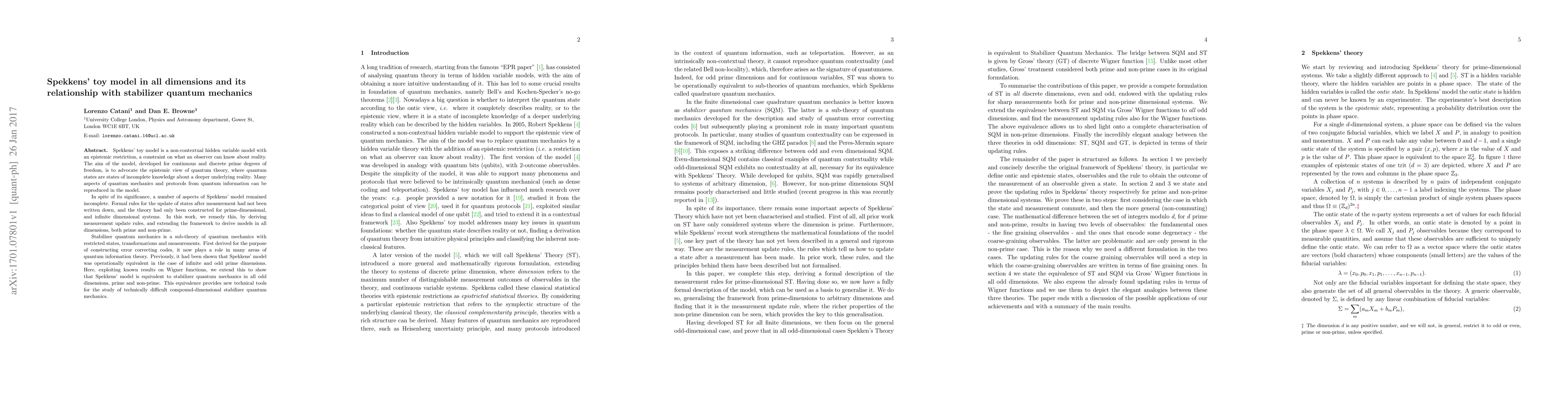Spekkens' toy model is a non-contextual hidden variable model with an epistemic restriction, a constraint on what an observer can know about reality. The aim of the model, developed for continuous and discrete prime degrees of freedom, is to advocate the epistemic view of quantum theory, where quantum states are states of incomplete knowledge about a deeper underlying reality. Many aspects of quantum mechanics and protocols from quantum information can be reproduced in the model. In spite of its significance, a number of aspects of Spekkens' model remained incomplete. Formal rules for the update of states after measurement had not been written down, and the theory had only been constructed for prime-dimensional, and infinite dimensional systems. In this work, we remedy this, by deriving measurement update rules, and extending the framework to derive models in all dimensions, both prime and non-prime. Stabilizer quantum mechanics is a sub-theory of quantum mechanics with restricted states, transformations and measurements. First derived for the purpose of constructing error correcting codes, it now plays a role in many areas of quantum information theory. Previously, it had been shown that Spekkens' model was operationally equivalent in the case of infinite and odd prime dimensions. Here, exploiting known results on Wigner functions, we extend this to show that Spekkens' model is equivalent to stabilizer quantum mechanics in all odd dimensions, prime and non-prime. This equivalence provides new technical tools for the study of technically difficult compound-dimensional stabilizer quantum mechanics.