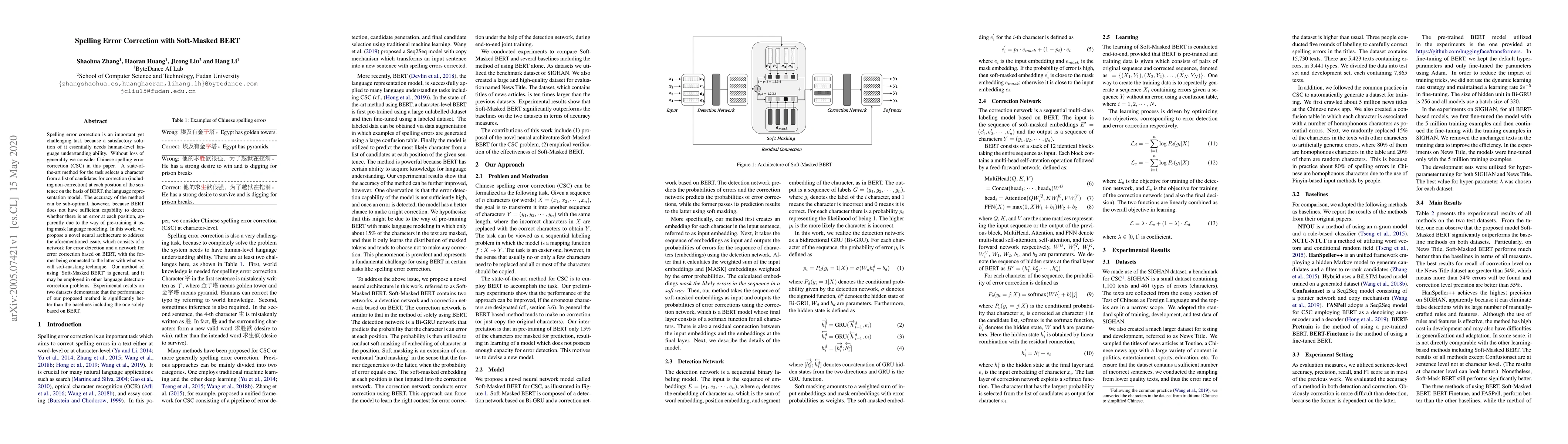 Spelling error correction is an important yet challenging task because a satisfactory solution of it essentially needs human-level language understanding ability. Without loss of generality we consider Chinese spelling error correction (CSC) in this paper. A state-of-the-art method for the task selects a character from a list of candidates for correction (including non-correction) at each position of the sentence on the basis of BERT, the language representation model. The accuracy of the method can be sub-optimal, however, because BERT does not have sufficient capability to detect whether there is an error at each position, apparently due to the way of pre-training it using mask language modeling. In this work, we propose a novel neural architecture to address the aforementioned issue, which consists of a network for error detection and a network for error correction based on BERT, with the former being connected to the latter with what we call soft-masking technique. Our method of using `Soft-Masked BERT' is general, and it may be employed in other language detection-correction problems. Experimental results on two datasets demonstrate that the performance of our proposed method is significantly better than the baselines including the one solely based on BERT.