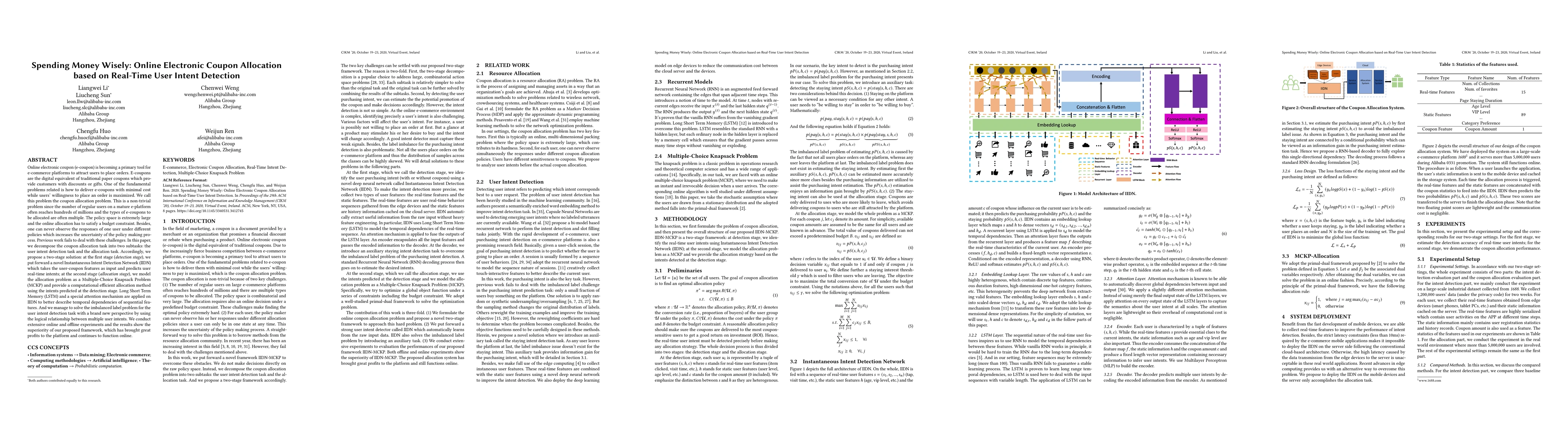 This paper proposes a two-stage framework for allocating online electronic coupons to maximize user order placement while adhering to budget constraints. It uses an Instantaneous Intent Detection Network (IIDN) to predict user real-time intents, followed by a Multiple-Choice Knapsack Problem (MCKP) approach for efficient allocation, demonstrating significant improvements in e-commerce platform profitability.