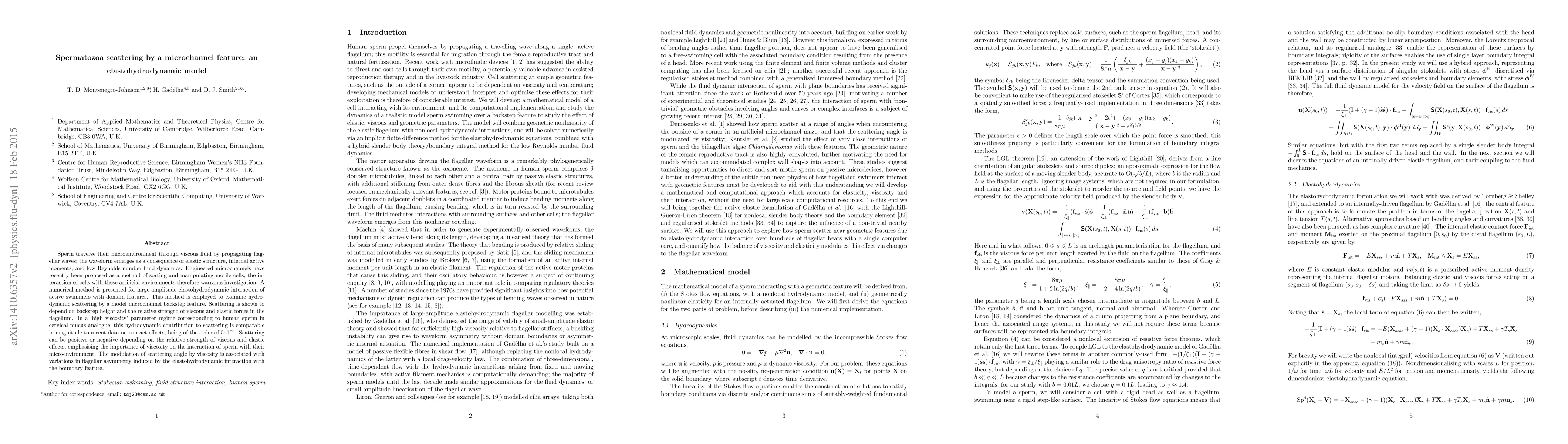 This paper presents a numerical model to study the elastohydrodynamic interaction of sperm with microchannel features, showing how scattering depends on backstep height and the relative strength of viscous and elastic forces. The findings indicate that viscosity significantly influences sperm scattering, with scattering angles modulated by flagellar asymmetry due to boundary interactions.