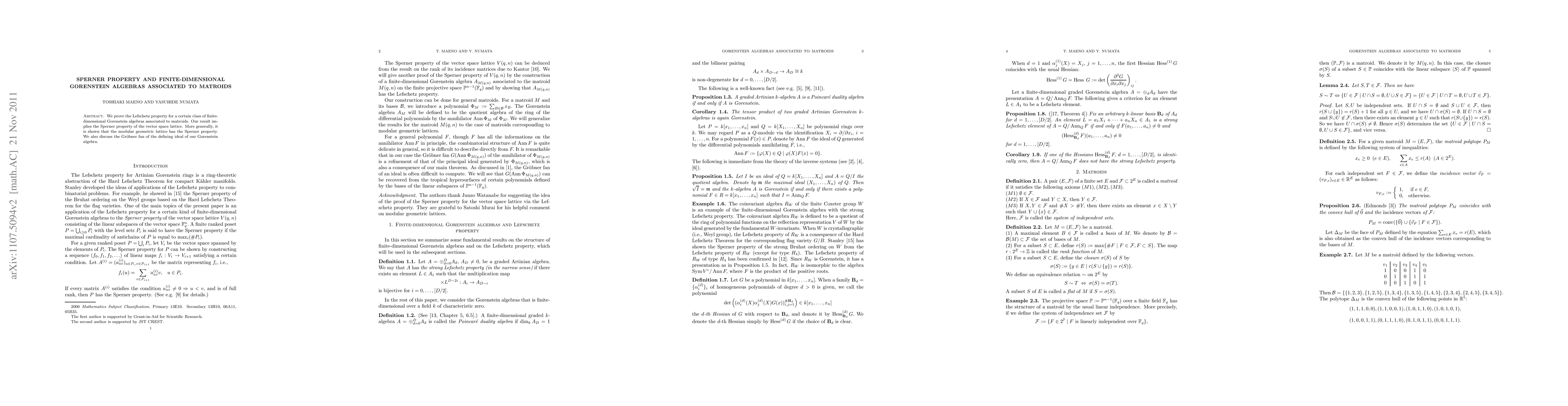 This research paper proves the Lefschetz property for a class of Gorenstein algebras associated to matroids, implying the Sperner property of certain lattices, including the vector space lattice and modular geometric lattice.