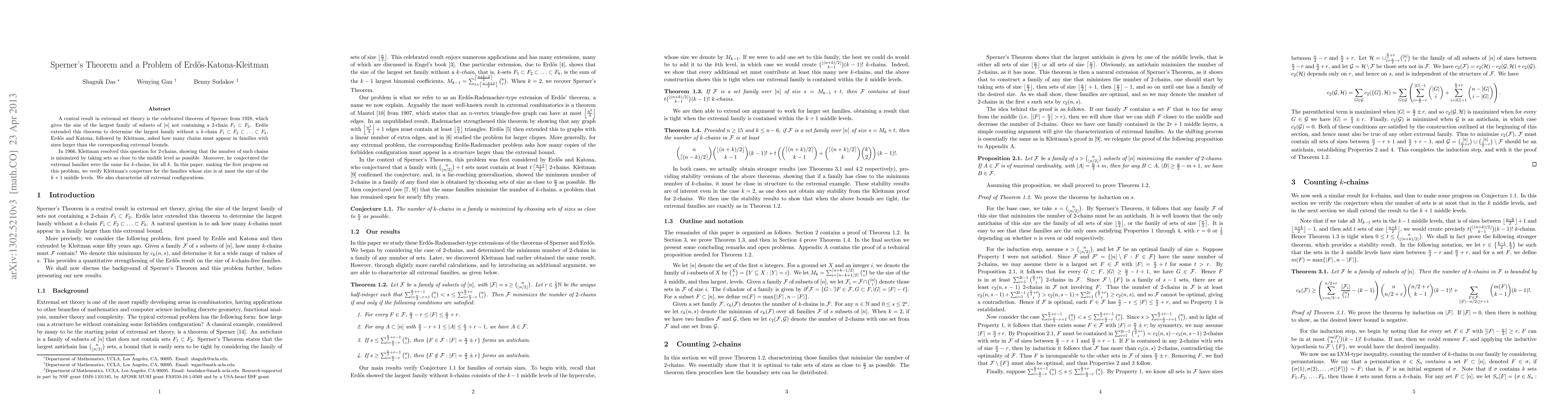 A central result in extremal set theory is the celebrated theorem of Sperner from 1928, which gives the size of the largest family of subsets of [n] not containing a 2-chain. Erdos extended this theorem to determine the largest family without a k-chain. Erdos and Katona, followed by Kleitman, asked how many chains must appear in families with sizes larger than the corresponding extremal bounds. In 1966, Kleitman resolved this question for 2-chains, showing that the number of such chains is minimized by taking sets as close to the middle level as possible. Moreover, he conjectured the extremal families were the same for k-chains, for all k. In this paper, making the first progress on this problem, we verify Kleitman's conjecture for the families whose size is at most the size of the $k+1$ middle levels. We also characterize all extremal configurations.