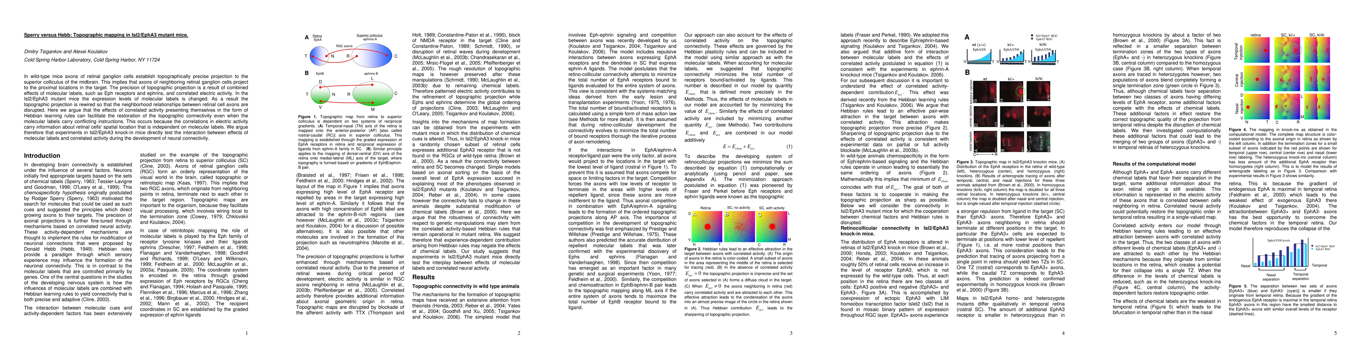 In wild-type mice axons of retinal ganglion cells establish topographically precise projection to the superior colliculus of the midbrain. This implies that axons of neighboring retinal ganglion cells project to the proximal locations in the target. The precision of topographic projection is a result of combined effects of molecular labels, such as Eph receptors and ephrins, and correlated electric activity. In the Isl2/EphA3 mutant mice the expression levels of molecular labels is changed. As a result the topographic projection is rewired so that the neighborhood relationships between retinal cell axons are disrupted. Here we argue that the effects of correlated activity presenting themselves in the form of Hebbian learning rules can facilitate the restoration of the topographic connectivity even when the molecular labels carry conflicting instructions. This occurs because the correlations in electric activity carry information about retinal cells' spatial location that is independent on molecular labels. We argue therefore that experiments in Isl2/EphA3 knock-in mice directly test the interaction between effects of molecular labels and correlated activity during the development of neural connectivity.