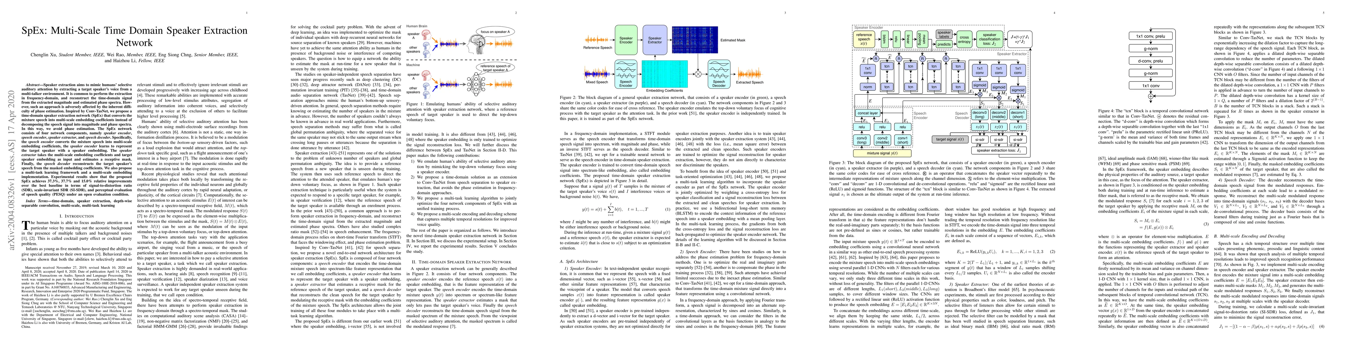 The SpEx network proposes a time-domain approach for speaker extraction, avoiding phase estimation by using multi-scale embedding coefficients. Experimental results show significant improvements in SDR, SI-SDR, and PESQ compared to baseline methods.