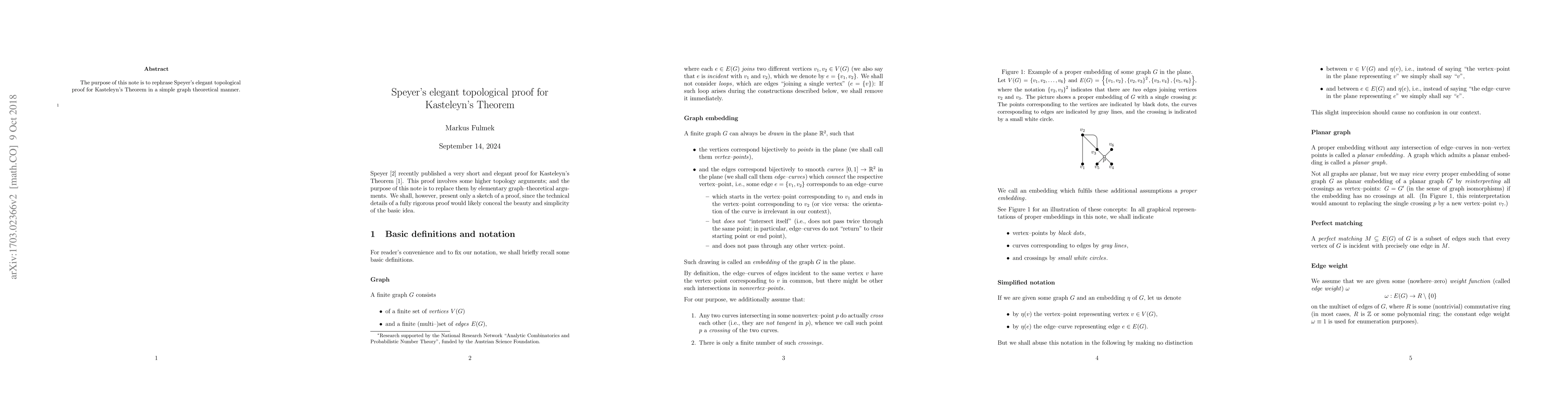 This paper rephrases Speyer's elegant topological proof for Kasteleyn's Theorem in simple graph theoretical terms, providing a clear explanation of the key findings.
