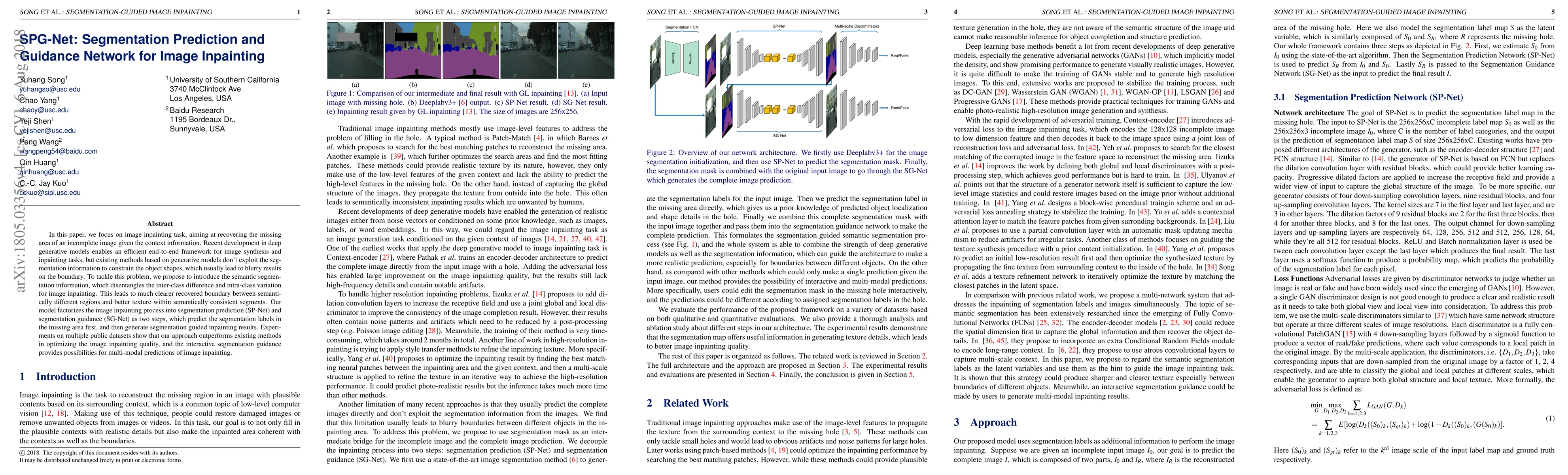 SPG-Net introduces a two-step framework for image inpainting that leverages semantic segmentation to improve boundary clarity and texture consistency. The model predicts segmentation labels first, then generates inpainting results guided by these segmentations, outperforming existing methods on public datasets.