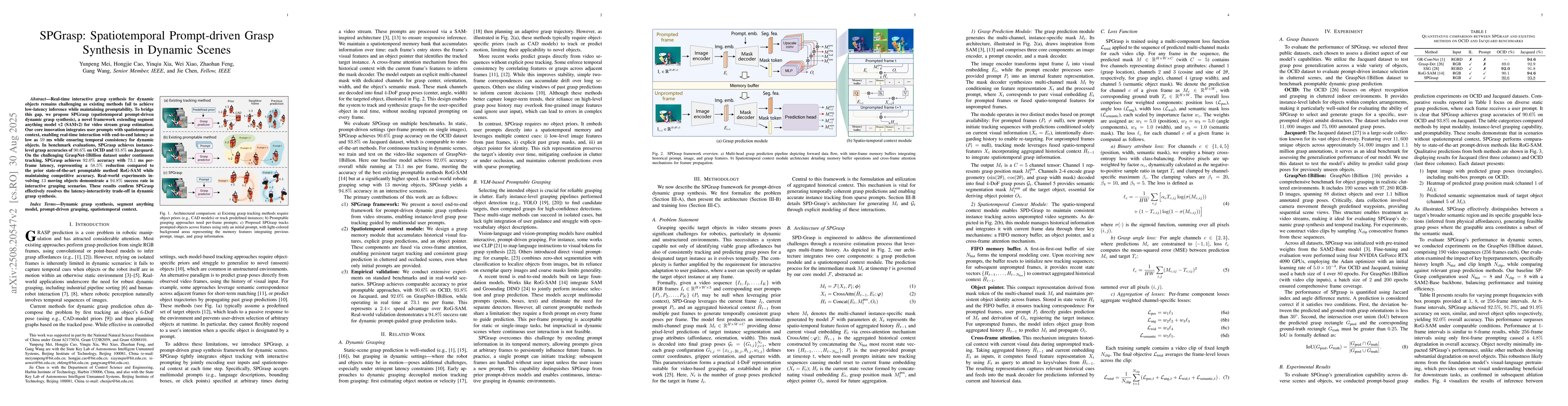 Real-time interactive grasp synthesis for dynamic objects remains challenging as existing methods fail to achieve low-latency inference while maintaining promptability. To bridge this gap, we propose SPGrasp (spatiotemporal prompt-driven dynamic grasp synthesis), a novel framework extending segment anything model v2 (SAMv2) for video stream grasp estimation. Our core innovation integrates user prompts with spatiotemporal context, enabling real-time interaction with end-to-end latency as low as 59 ms while ensuring temporal consistency for dynamic objects. In benchmark evaluations, SPGrasp achieves instance-level grasp accuracies of 90.6% on OCID and 93.8% on Jacquard. On the challenging GraspNet-1Billion dataset under continuous tracking, SPGrasp achieves 92.0% accuracy with 73.1 ms per-frame latency, representing a 58.5% reduction compared to the prior state-of-the-art promptable method RoG-SAM while maintaining competitive accuracy. Real-world experiments involving 13 moving objects demonstrate a 94.8% success rate in interactive grasping scenarios. These results confirm SPGrasp effectively resolves the latency-interactivity trade-off in dynamic grasp synthesis.