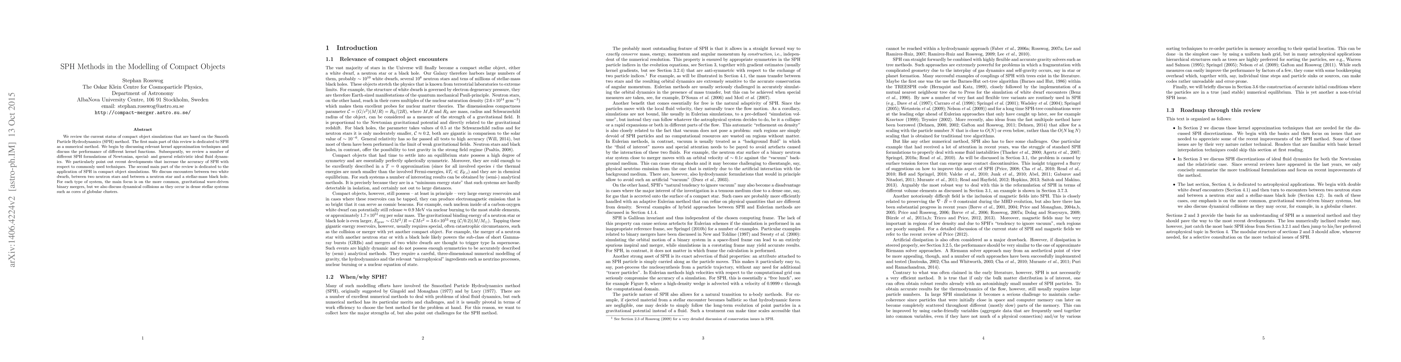 We review the current status of compact object simulations that are based on the Smooth Particle Hydrodynamics (SPH) method. The first main part of this review is dedicated to SPH as a numerical method. We begin by discussing relevant kernel approximation techniques and discuss the performance of different kernel functions. Subsequently, we review a number of different SPH formulations of Newtonian, special- and general relativistic ideal fluid dynamics. We particularly point out recent developments that increase the accuracy of SPH with respect to commonly used techniques. The second main part of the review is dedicated to the application of SPH in compact object simulations. We discuss encounters between two white dwarfs, between two neutron stars and between a neutron star and a stellar-mass black hole. For each type of system, the main focus is on the more common, gravitational wave-driven binary mergers, but we also discuss dynamical collisions as they occur in dense stellar systems such as cores of globular clusters.