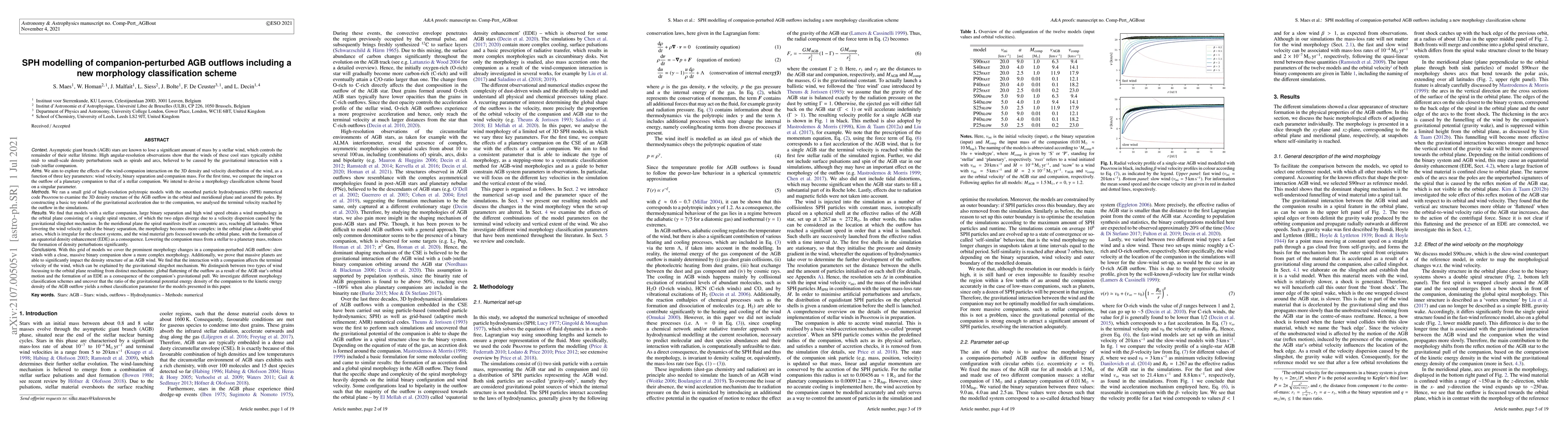 The research presents a detailed SPH modelling of AGB outflows perturbed by companions, including an analysis of morphological changes, terminal velocity impacts, and vertical wind compression.