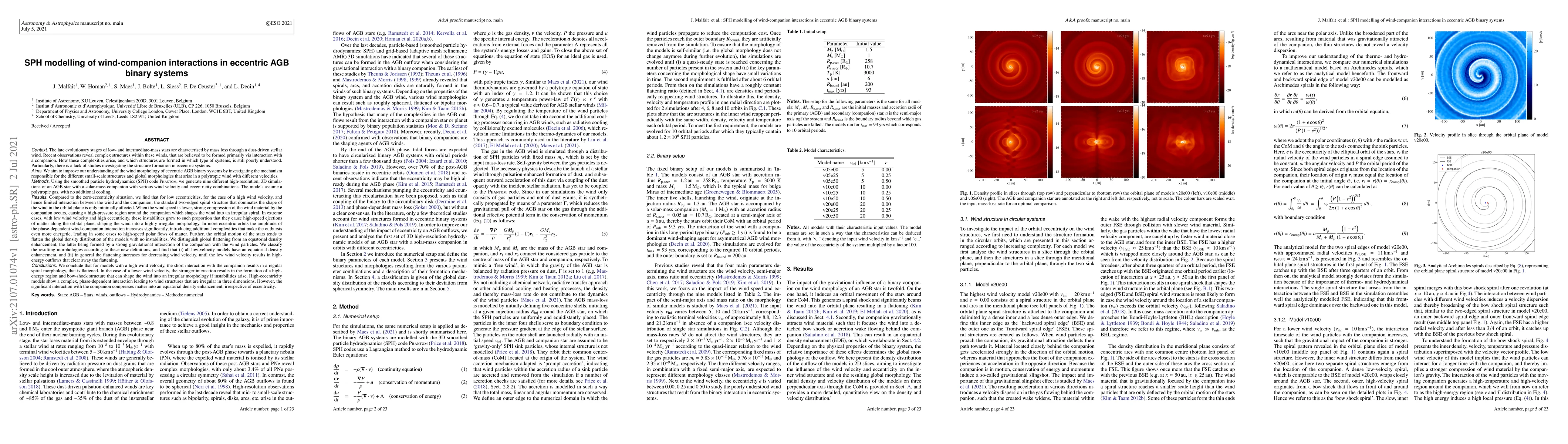 Researchers used SPH modeling to study wind interactions with companions in eccentric AGB binary systems, finding that high wind velocities lead to regular spiral morphologies and lower velocities result in bow-shock structures.