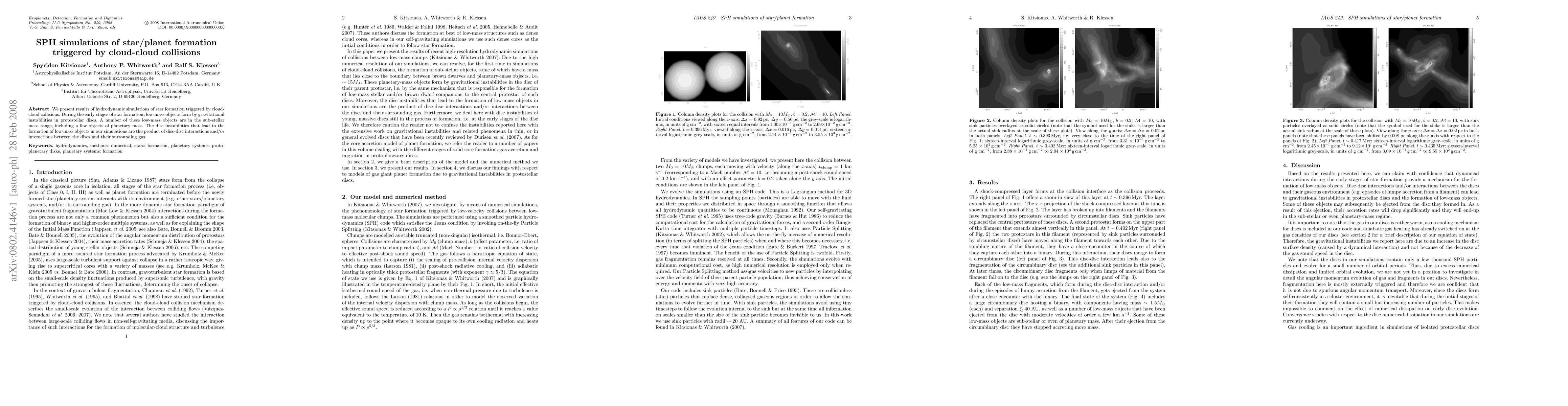 We present results of hydrodynamic simulations of star formation triggered by cloud-cloud collisions. During the early stages of star formation, low-mass objects form by gravitational instabilities in protostellar discs. A number of these low-mass objects are in the sub-stellar mass range, including a few objects of planetary mass. The disc instabilities that lead to the formation of low-mass objects in our simulations are the product of disc-disc interactions and/or interactions between the discs and their surrounding gas.
