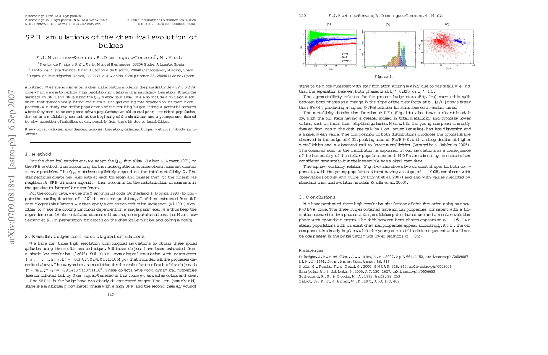 This paper uses SPH simulations to model the chemical evolution of galaxy bulges, revealing two distinct stellar populations: an old, metal-poor, $\alpha$-enriched group formed early, and a younger population formed through accretion of gas or satellites. The model incorporates supernova feedback and metal diffusion.