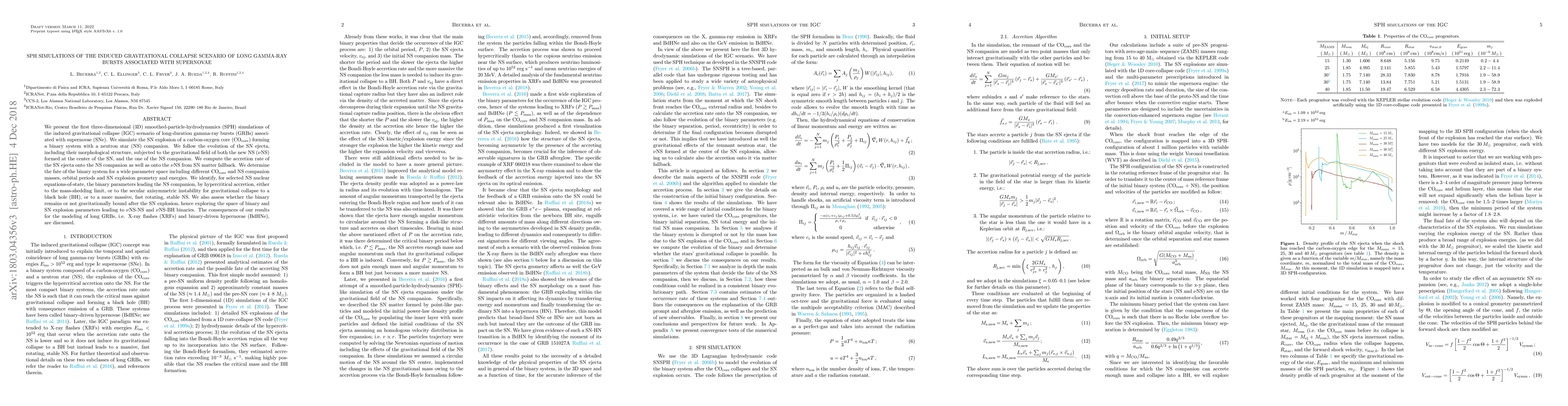 This paper presents the first 3D SPH simulations of the induced gravitational collapse scenario for long-duration gamma-ray bursts (GRBs) linked to supernovae (SNe). The study explores the evolution of SN ejecta in binary systems, assessing the fate of neutron stars (NS) and their potential collapse into black holes (BH) or formation of more massive NS, and discusses implications for long GRB modeling.