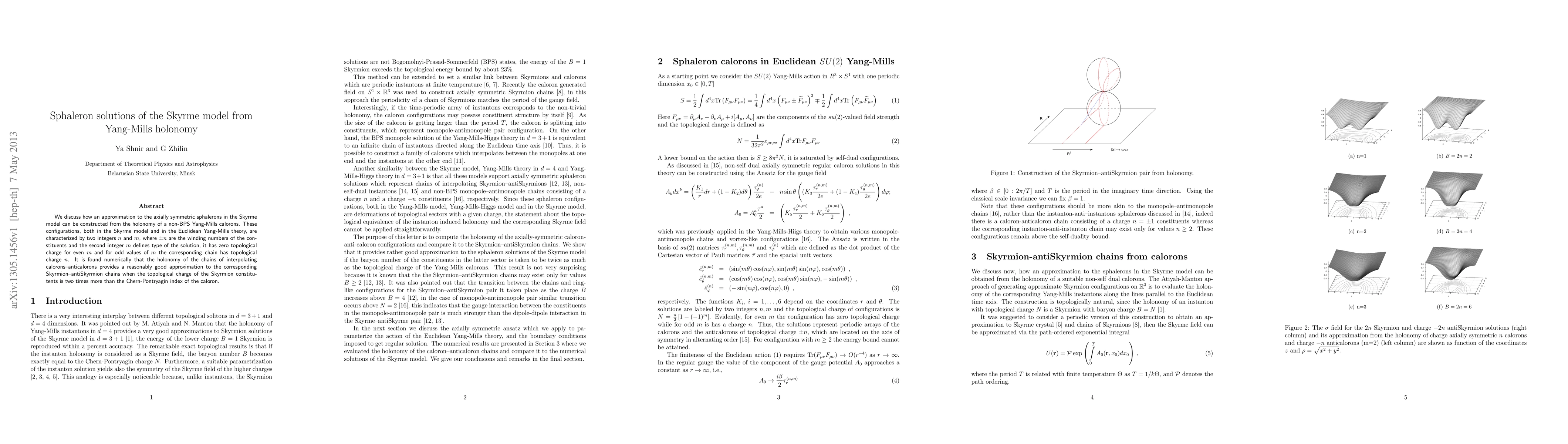 This paper explores the construction of axially symmetric sphaleron solutions in the Skyrme model using the holonomy of non-BPS Yang-Mills calorons. It finds that chains of interpolating calorons-anticalorons approximate Skyrmion-antiSkyrmion chains when the Skyrmion's topological charge is twice the caloron's Chern-Pontryagin index.