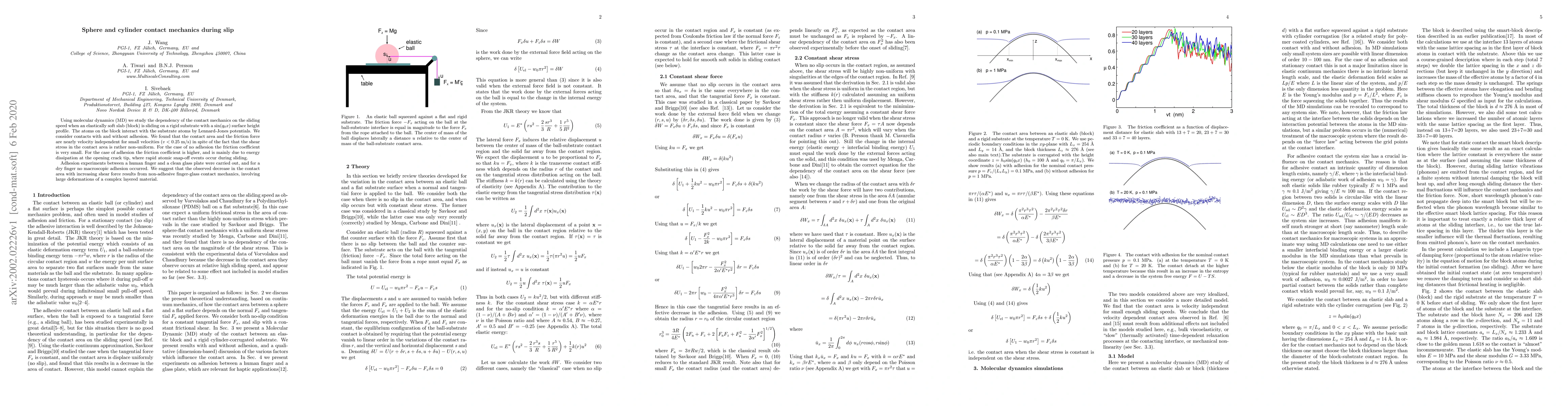 Using molecular dynamics (MD) we study the dependency of the contact mechanics on the sliding speed when an elastically soft slab (block) is sliding on a rigid substrate with a ${\rm sin} (q_0 x)$ surface height profile. The atoms on the block interact with the substrate atoms by Lennard-Jones potentials. We consider contacts with and without adhesion. We found that the contact area and the friction force are nearly velocity independent for small velocities ($v < 0.25 \ {\rm m/s}$) in spite of the fact that the shear stress in the contact area is rather non-uniform. For the case of no adhesion the friction coefficient is very small. For the case of adhesion the friction coefficient is higher, and is mainly due to energy dissipation at the opening crack tip, where rapid atomic snap-off events occur during sliding. Adhesion experiments between a human finger and a clean glass plate were carried out, and for a dry finger no macroscopic adhesion occurred. We suggest that the observed decrease in the contact area with increasing shear force results from non-adhesive finger-glass contact mechanics, involving large deformations of a complex layered material.