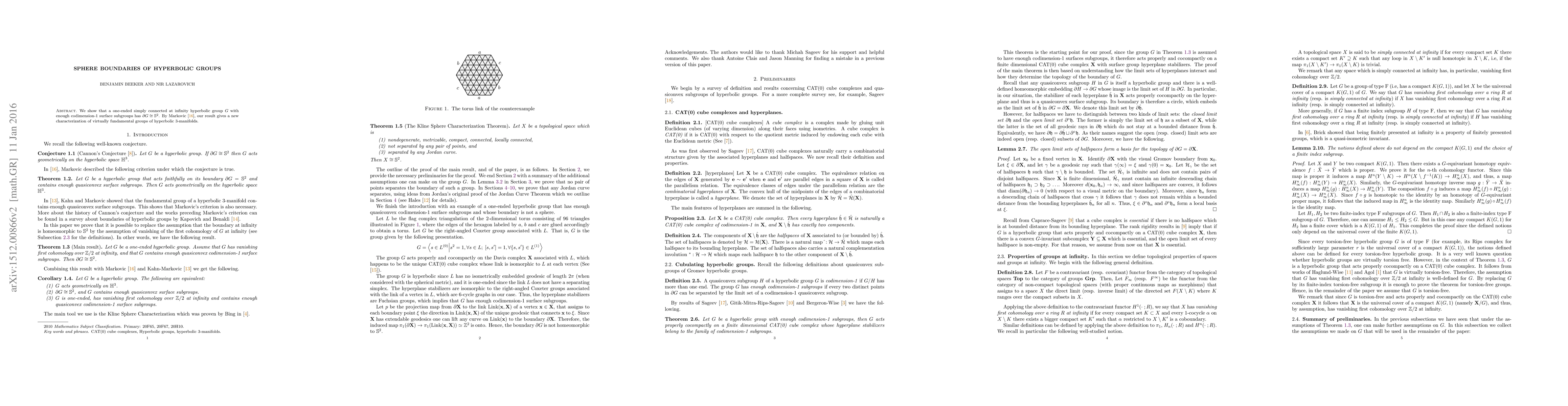Summary: This paper demonstrates that one-ended, simply connected at infinity hyperbolic groups with certain codimension-1 surface subgroups have a boundary homeomorphic to a 2-sphere, providing a new characterization of virtually fundamental groups of hyperbolic 3-manifolds in conjunction with Markovic's results.