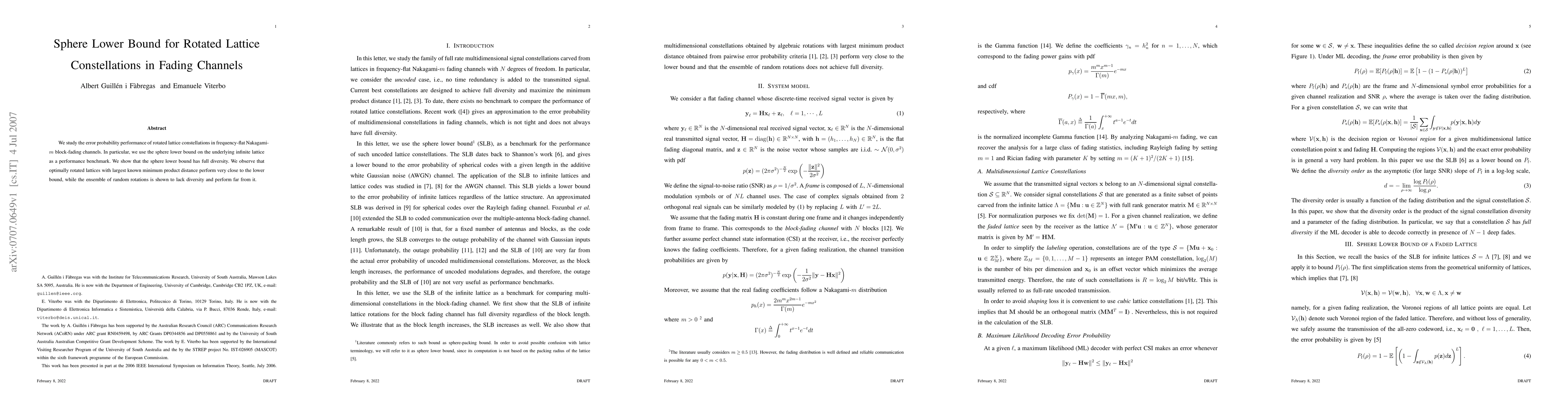This paper investigates the error probability of rotated lattice constellations in Nakagami-$m$ fading channels, using the sphere lower bound as a benchmark. It demonstrates that the sphere lower bound achieves full diversity, and optimal rotations closely approach this bound, whereas random rotations exhibit poor diversity and performance.
