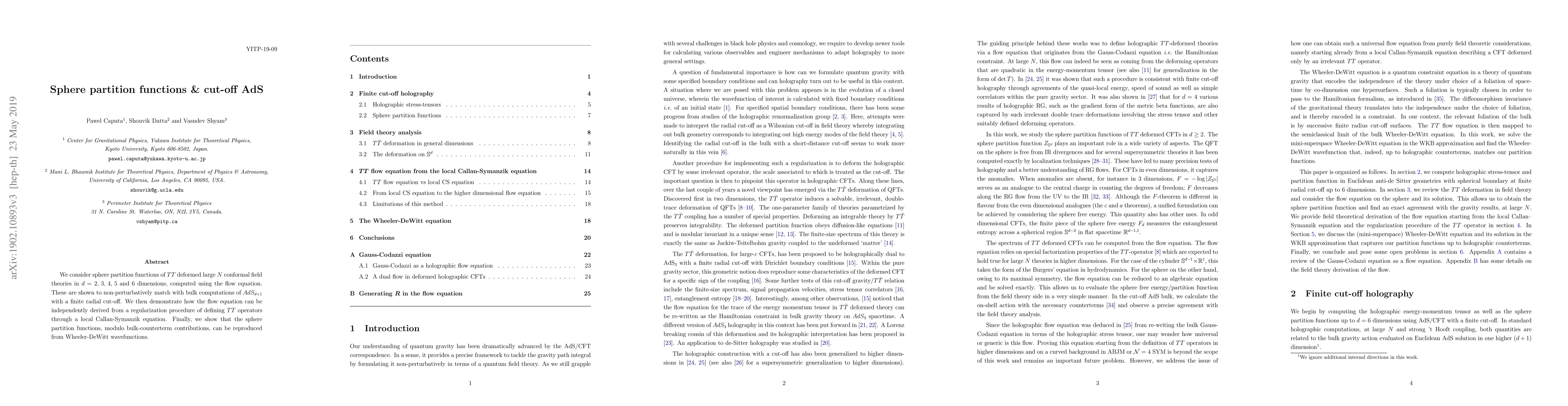 This research paper explores sphere partition functions of deformed conformal field theories in various dimensions, showing they match with AdS bulk computations using a finite radial cut-off. The flow equation method is used and independently derived from a regularization procedure for TT operators. The sphere partition functions, excluding bulk-counterterm contributions, are linked to Wheeler-DeWitt wave functions.