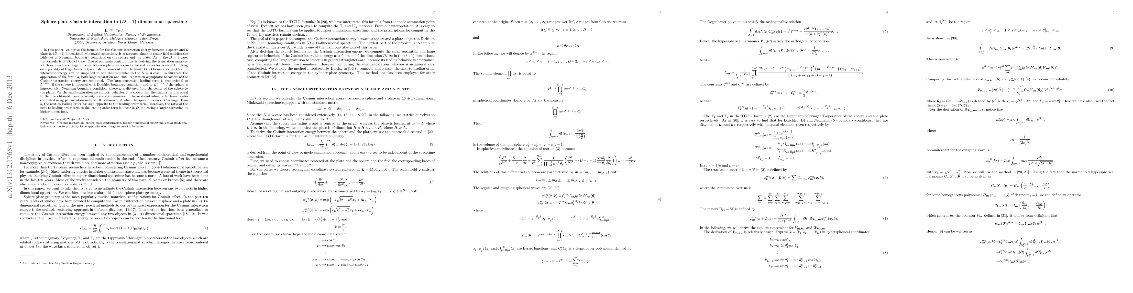 This paper derives the Casimir interaction energy formula between a sphere and a plate in $(D+1)$-dimensional spacetime, showing it is similar to the $D=3$ case. It introduces translation matrices for general $D$ and computes both large and small separation asymptotic behaviors, revealing significant differences in higher dimensions.