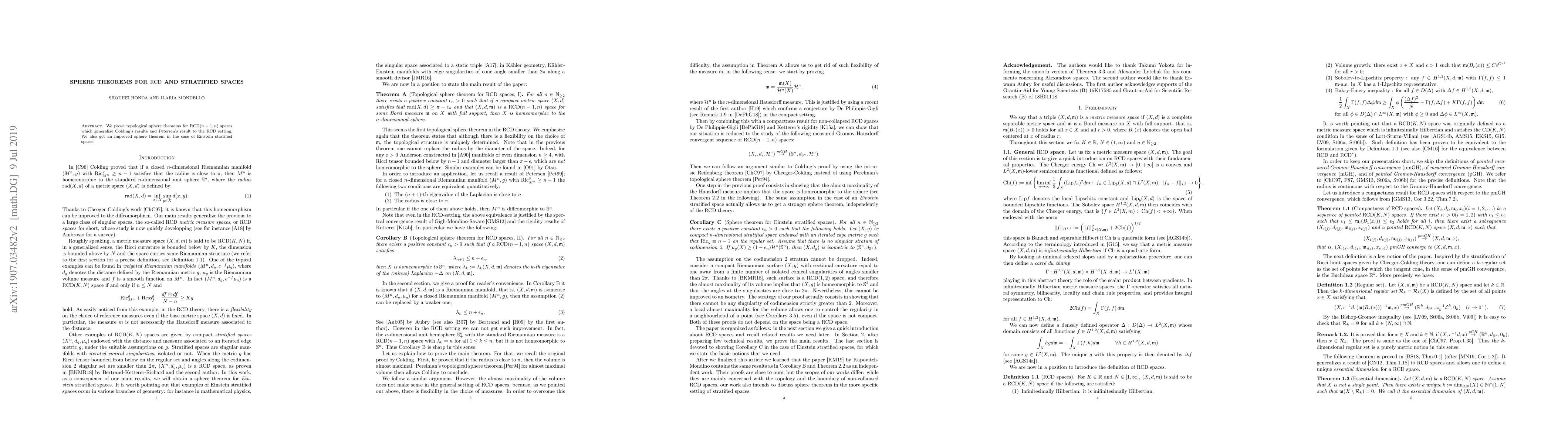 The paper proves topological sphere theorems for RCD(n-1, n) spaces, generalizing Colding's results and Petersen's result to the RCD setting. It also provides an improved sphere theorem for Einstein stratified spaces.