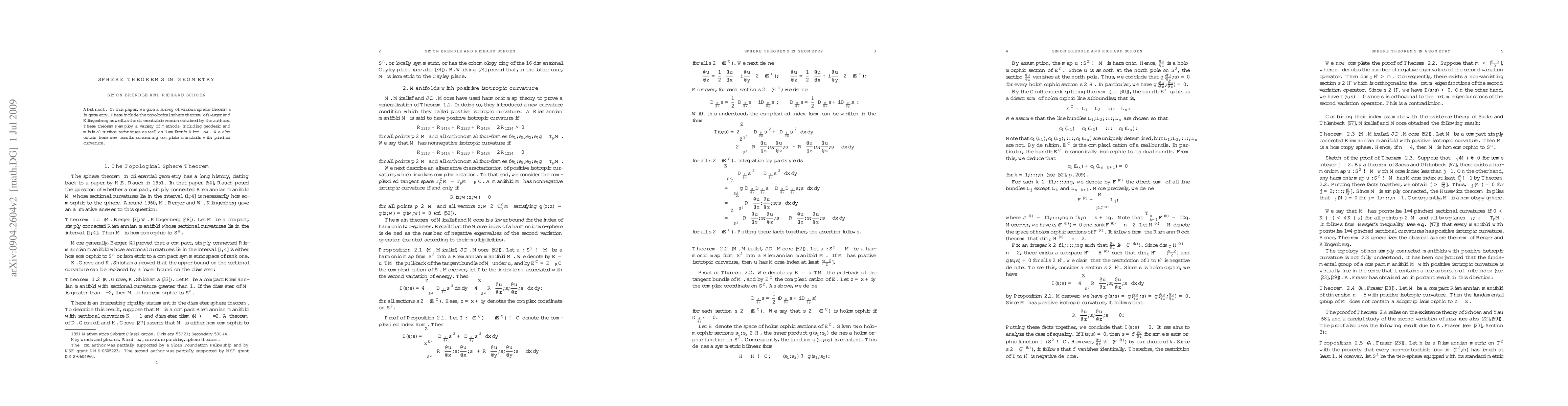 This paper surveys various sphere theorems in geometry, including topological and differentiable versions, utilizing methods like geodesic and minimal surface techniques, and Hamilton's Ricci flow, with new results on complete manifolds with pinched curvature.