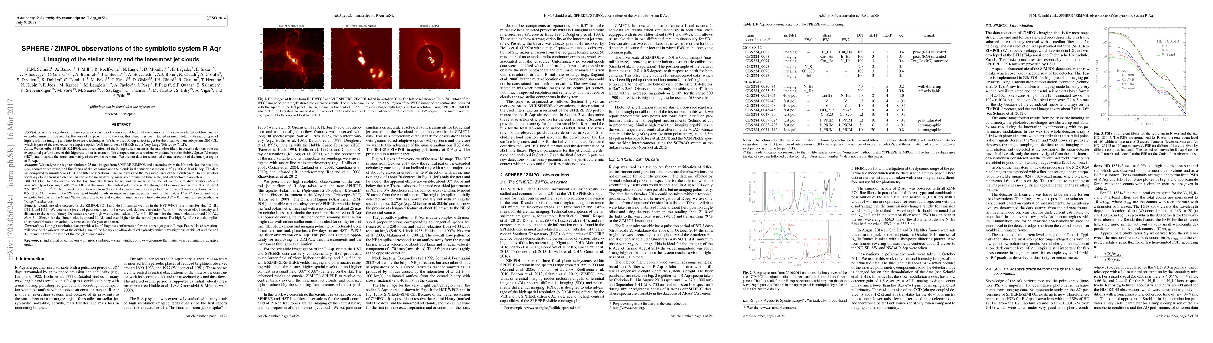 R Aqr is a symbiotic binary system consisting of a mira variable, a hot companion with a spectacular jet outflow, and an extended emission line nebula. We have used R Aqr as test target for the visual camera subsystem ZIMPOL, which is part of the new extreme adaptive optics (AO) instrument SPHERE at the Very Large Telescope (VLT). We compare our observations with data from the Hubble Space Telescope (HST) and illustrate the complementarity of the two instruments. We determine from the Halpha emission the position, size, geometric structure, and line fluxes of the jet source and the clouds in the innermost region (<2") of R Aqr and determine Halpha emissivities mean density, mass, recombination time scale, and other cloud parameters. Our data resolve for the first time the R Aqr binary and we measure for the jet source a relative position 46+/-1 mas West of the mira. The central jet source is the strongest Halpha component. North east and south west from the central source there are many clouds with very diverse structures. We see in the SW a string of bright clouds arranged in a zig-zag pattern and, further out, more extended bubbles. In the N and NE we see a bright, very elongated filamentary structure and faint perpendicular "wisps" further out. Some jet clouds are also detected in the ZIMPOL [OI] and He I filters, as well as in the HST line filters for Halpha, [OIII], [NII], and [OI]. We determine jet cloud parameters and find a very well defined anti-correlation between cloud density and distance to the central binary. Future Halpha observations will provide the orientation of the orbital plane of the binary and allow detailed hydrodynamical investigations of this jet outflow and its interaction with the wind of the red giant companion.