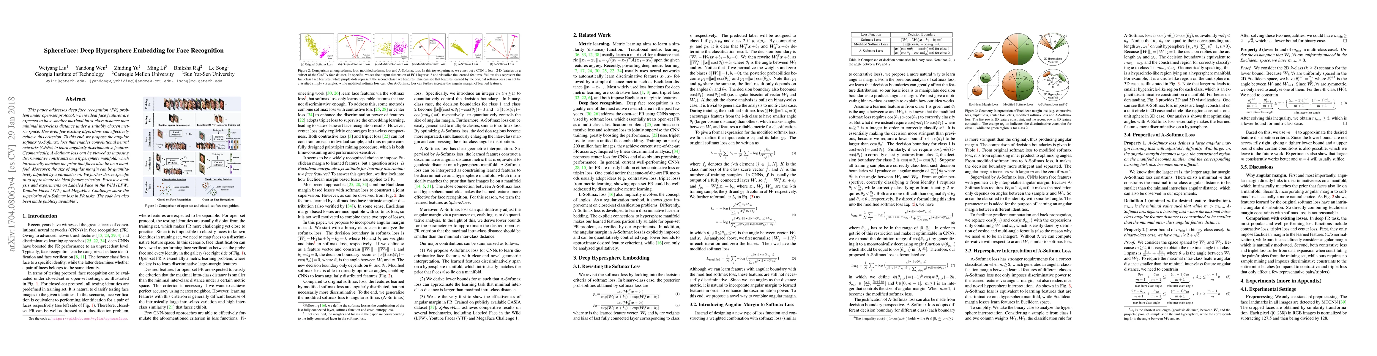 This paper proposes the angular softmax (A-Softmax) loss to improve deep face recognition under an open-set protocol, enabling CNNs to learn angularly discriminative features on a hypersphere manifold. Experiments on LFW, YTF, and MegaFace demonstrate the effectiveness of the proposed method.