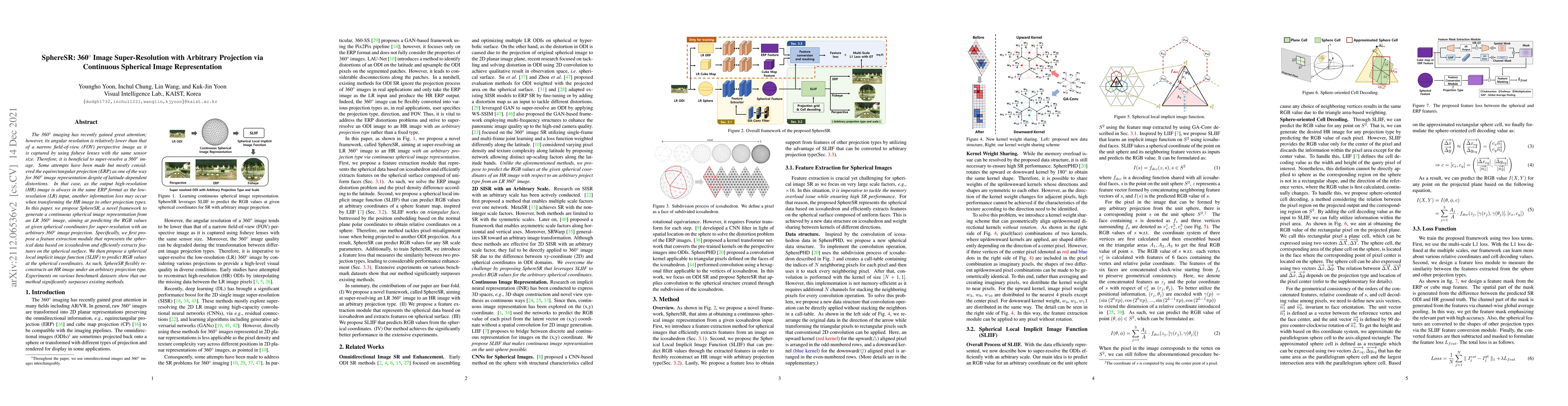 SphereSR proposes a novel framework for 360° image super-resolution using continuous spherical image representation, enabling flexible reconstruction under any projection type without latitude-dependent distortions. The method outperforms existing methods in experiments on benchmark datasets.