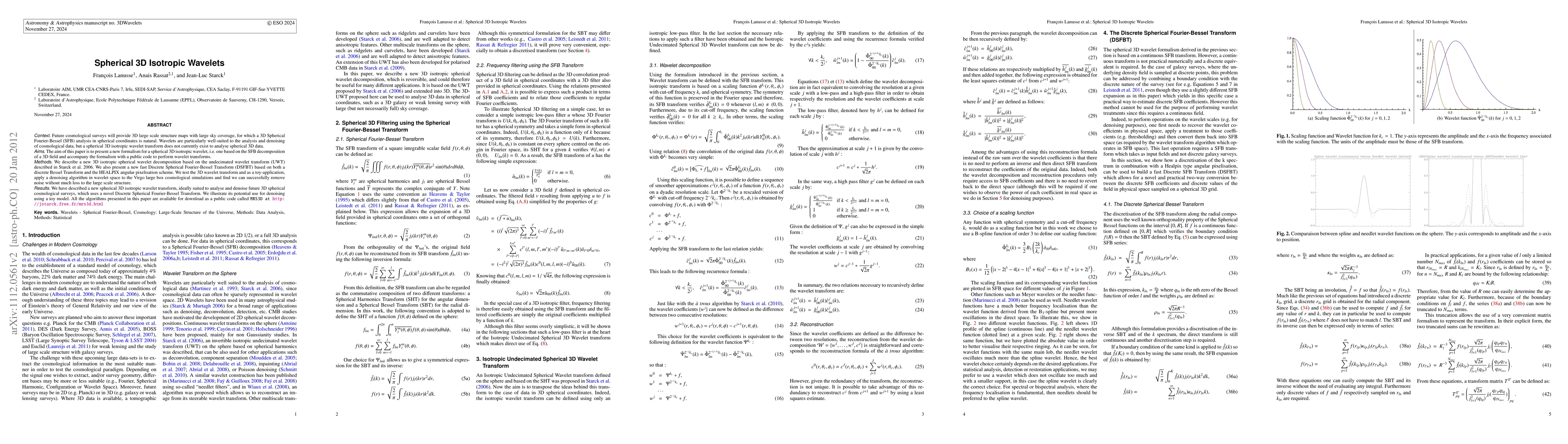 This paper introduces a new spherical 3D isotropic wavelet transform based on the undecimated wavelet transform and a fast Discrete Spherical Fourier-Bessel Transform, designed for analyzing and denoising large-scale cosmological data. The authors demonstrate its effectiveness through a denoising application on Virgo simulations and provide a public code for further use.