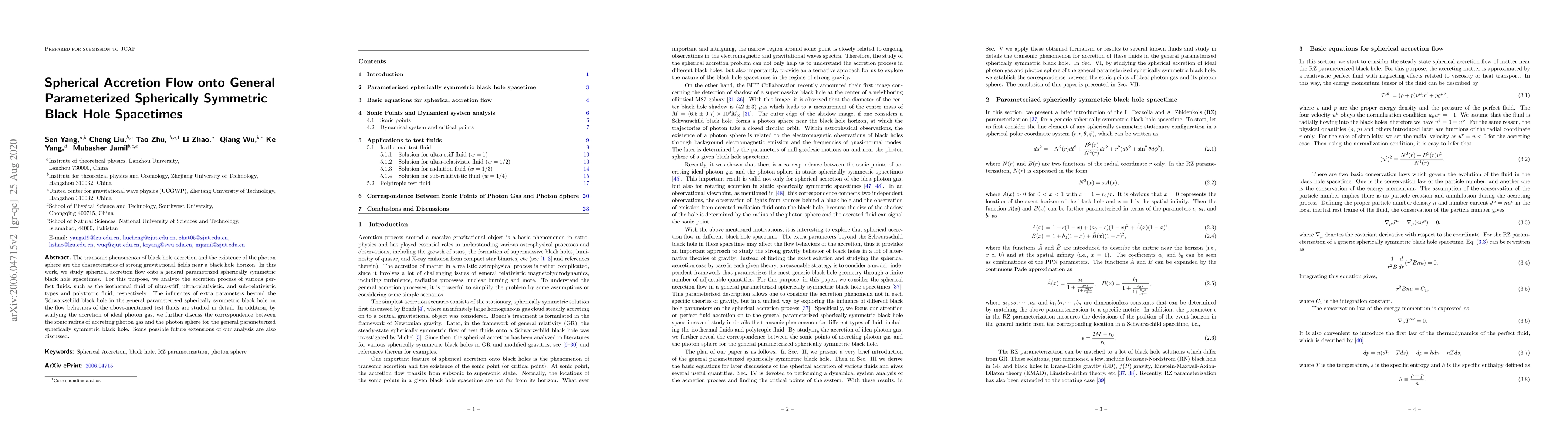 This paper investigates spherical accretion flows onto general parameterized spherically symmetric black hole spacetimes, examining various perfect fluids and the influence of extra parameters. It also explores the relationship between the sonic radius of accreting photon gas and the photon sphere, suggesting future research directions.